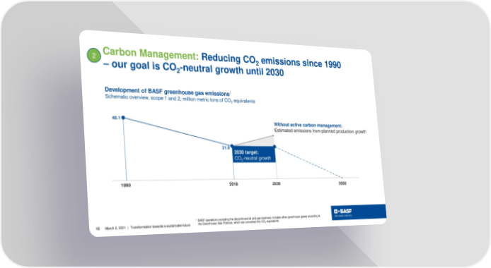 2 Carbon Management: Reducing CO2 emissions since 1990 – our goal is CO2-neutral growth until 2030 1 Development of BASF greenhouse gas emissions Schematic overview, scope 1 and 2, million metric tons of CO2 equivalents 40.1 Without active carbon management: Estimated emissions from planned production growth 21.9 2030 target: CO -neutral growth 2 1990 2018 2030 2050 1 BASF operations excluding the discontinued oil and gas business; includes other greenhouse gases according to 12 March 2, 2021 | Transformation towards a sustainable future the Greenhouse Gas Protocol, which are converted into CO2 equivalents