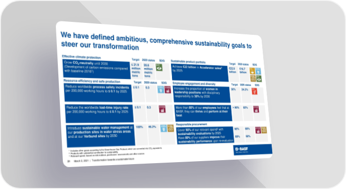 We have defined ambitious, comprehensive sustainability goals to steer our transformation Effective climate protection Target 2020 status SDG Sustainable product portfolio Target 2020 status SDG Grow CO -neutrally until 2030 ≤ 21.9 20.8 Achieve €22 billion in Accelerator sales2 €22.0 €16.7 2 million million billion billion (Development of carbon emissions compared by 2025 1 metric metric with baseline 2018 ) tons tons Resource efficiency and safe production Target 2020 status SDG Employee engagement and diversity Target 2020 status SDG Reduce worldwide process safety incidents ≤ 0.1 0.3 Increase the proportion of women in 30% 24.3% per 200,000 working hours to ≤ 0.1 by 2025 leadership positions with disciplinary responsibility to 30% by 2030 Reduce the worldwide lost-time injury rate ≤ 0.1 0.3 More than 80% of our employees feel that at > 80% 82% per 200,000 working hours to ≤ 0.1 by 2025 BASF, they can thrive and perform at their best Introduce sustainable water management at 100% 46.2% Responsible procurement our production sites in water stress areas Cover 90% of our relevant spend3 with 90% 80% and at our Verbund sites by 2030 sustainability evaluations by 2025 Have 80%of our suppliers improve their 80% 68% sustainability performance upon re-evaluation 1 Includes other gases according to the Greenhouse Gas Protocol, which are converted into CO2 equivalents 2 Products with substantial contribution to sustainability 3 Relevant spend; based on risk matrices, purchasers’ assessments and other sources 21 March 2, 2021 | Transformation towards a sustainable future