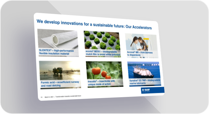 We develop innovations for a sustainable future: Our Accelerators ® ® ® SLENTEX –high-performance ecovio M2351 –biodegradable Acronal MB –from biomass flexible insulation material mulch film to avoid white pollution to dispersions Formic acid – ecoefficient runway Inscalis® – insecticide with Synative® ES TMP – biodegradable and road deicing unique mode of action marine lubricants 11 March 2, 2021 | Transformation towards a sustainable future