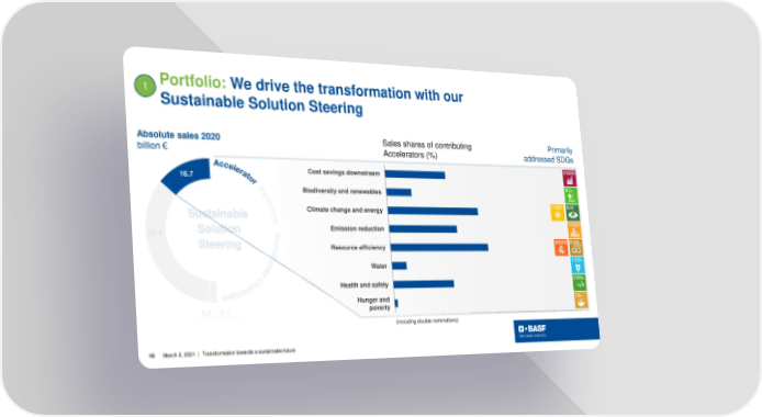 1 Portfolio: We drive the transformation with our Sustainable Solution Steering Absolute sales 2020 Sales shares of contributing Primarily billion € Accelerators (%) addressed SDGs 16.7 Cost savings downstream Biodiversity and renewables Sustainable Climate change and energy 30.5 Solution Emission reduction Steering Resource efficiency Water Health and safety Hunger and 6.8 0.1 poverty (including double nominations) 10 March 2, 2021 | Transformation towards a sustainable future