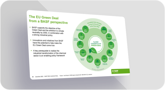 The EU Green Deal from a BASF perspective BASF supports the objective of the Green Deal and the ambition to climate neutrality by 2050, in combination with a strong industrial policy Innovations and initiatives from BASF have the potential to help make the EU Green Deal come true A key prerequisite to realize the industrial transformation of the chemical sector is an enabling policy framework 30 December2022 | BASF ESG Investment Story 1 Scope 1 and Scope 2; 2030 target compared with 1990: 60% CO reduction 2