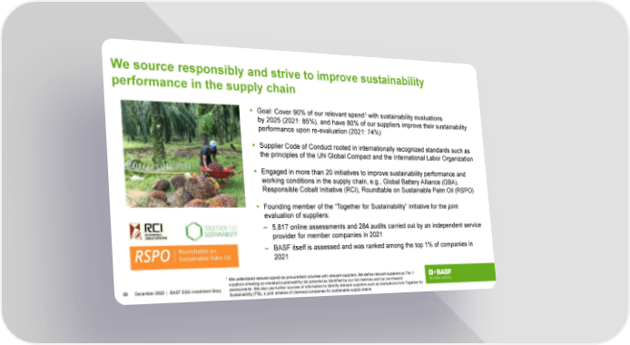 We source responsibly and strive to improve sustainability performance in the supply chain Goal: Cover 90% of our relevant spend1 with sustainability evaluations by 2025 (2021: 85%), and have 80% of our suppliers improve their sustainability performance upon re-evaluation (2021: 74%) Supplier Code of Conduct rooted in internationally recognized standards such as the principles of the UN Global Compact and the International Labor Organization Engaged in more than 20 initiatives to improve sustainability performance and working conditions in the supply chain, e.g., Global Battery Alliance (GBA), Responsible Cobalt Initiative (RCI), Roundtable on Sustainable Palm Oil (RSPO) Founding member of the “Together for Sustainability” initiative for the joint evaluation of suppliers: – 5,817 online assessments and 284 audits carried out by an independent service provider for member companies in 2021 – BASF itself is assessed and was ranked among the top 1% of companies in 2021 1 We understand relevant spend as procurement volumes with relevant suppliers. We define relevant suppliers as Tier 1 suppliers showing an elevated sustainability risk potential as identified by our risk matrices and our purchasers’ 32 December2022 | BASF ESG Investment Story assessments. We also use further sources of information to identify relevant suppliers such as evaluations from Together for Sustainability (TfS), a joint initiative of chemical companies for sustainable supply chains.