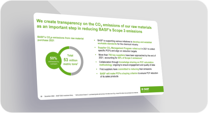 We create transparency on the CO2 emissions of our raw materials as an important step in reducing BASF’s Scope 3 emissions BASF’s CO e emissions from raw material 2 BASF is supporting various initiatives to develop and establish purchase 2021 workable standards for the chemical industry Supplier CO Management Program rolled-out in 2021 to collect 2 specific PCFs and align on reduction targets Total More than 700 key suppliers have been approached by the end of 50% 53 million 2021, accounting for 50% of Scope 3 emissions1 addressed by 1 Collaboration through knowledge sharing on PCF calculation outreach metric tons methodology ongoing to ensure engagement and quality of data First suppliers have committed to reducing their emissions BASF will make PCFs a buying criterion to ensure PCF reduction of its sales products 23 December2022 | BASF ESG Investment Story 1 GHG protocol Scope 3.1: purchased goods and services: 55 million tons CO e, thereof 53 million tons purchased raw materials 2