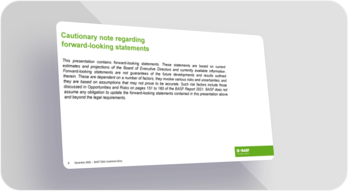 Cautionary note regarding forward-looking statements This presentation contains forward-looking statements. These statements are based on current estimates and projections of the Board of Executive Directors and currently available information. Forward-looking statements are not guarantees of the future developments and results outlined therein. These are dependent on a number of factors; they involve various risks and uncertainties; and they are based on assumptions that may not prove to be accurate. Such risk factors include those discussed in Opportunities and Risks on pages 151 to 160 of the BASF Report 2021. BASF does not assume any obligation to update the forward-looking statements contained in this presentation above and beyond the legal requirements. 2 December2022 | BASF ESG Investment Story