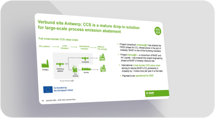 Verbund site Antwerp: CCS is a mature drop-in solution for large-scale process emission abatement Full cross-border CCS value chain Project consortium Antwerp@C has entered the Local International Offshore FEED phase for CO infrastructure in the port of CO2capture transport transport CO storage 2 2 Antwerp; BASF is one of the founding members Project Kairos@C – a consortium of BASF and Air Liquide – has entered the project engineering via pipeline phase at BASF’s Antwerp Verbund site International cross-border CCS value chain Gathering aiming to reduce BASF’s CO emissions in Emitters 2 pipeline via ship Antwerp by 1 million tons per year in a first step CO 2 terminal Planned to be operational by 2025 Scope Antwerp@C 18 December2022 | BASF ESG Investment Story