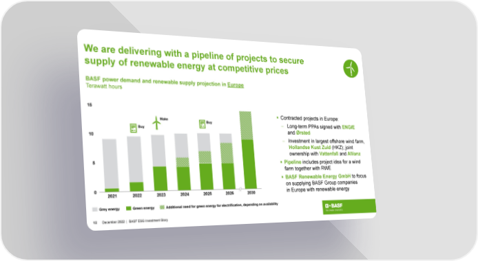 We are delivering with a pipeline of projects to secure supply of renewable energy at competitive prices BASF power demand and renewable supply projection in Europe Terawatt hours 15 Make Contracted projects in Europe: Buy − Long-term PPAs signed with ENGIE Buy and Ørsted 10 − Investment in largest offshore wind farm, Hollandse Kust Zuid (HKZ); joint ownership with Vattenfall and Allianz 5 Pipeline includes project idea for a wind farm together with RWE BASF Renewable Energy GmbH to focus 0 on supplying BASF Group companies 2021 2022 2023 2024 2025 2026 2030 in Europe with renewable energy Grey energy Green energy Additional need for green energy for electrification, depending on availability 12 December2022 | BASF ESG Investment Story