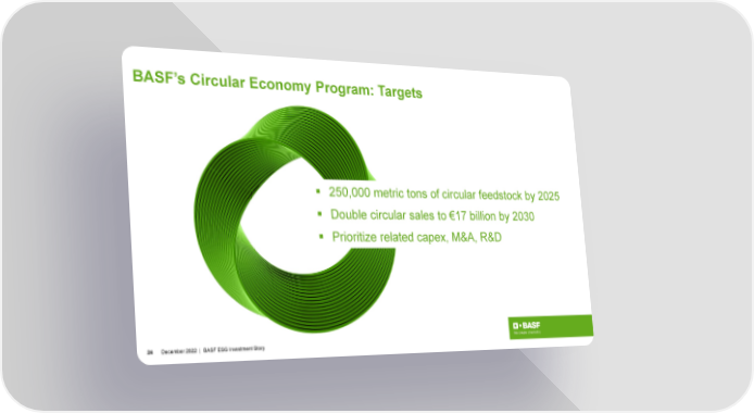 BASF’s Circular Economy Program: Targets 250,000 metric tons of circular feedstock by 2025 Double circular sales to €17 billion by 2030 Prioritize related capex, M&A, R&D 24 December2022 | BASF ESG Investment Story