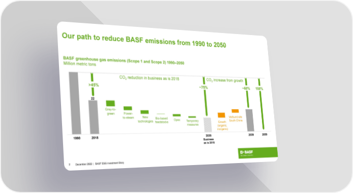 Our path to reduce BASF emissions from 1990 to 2050 BASF greenhouse gas emissions (Scope 1 and Scope 2) 1990–2050 Million metric tons CO reduction in business as is 2018 CO increase from growth 2 2 >45% ~75% ~60% 100% Grey-to- green Power- to-steam New Bio-based Opex Verbund site technologies feedstocks Temporary Growth South China measures (organic, inorganic) Business asis2018 7 December2022 | BASF ESG Investment Story