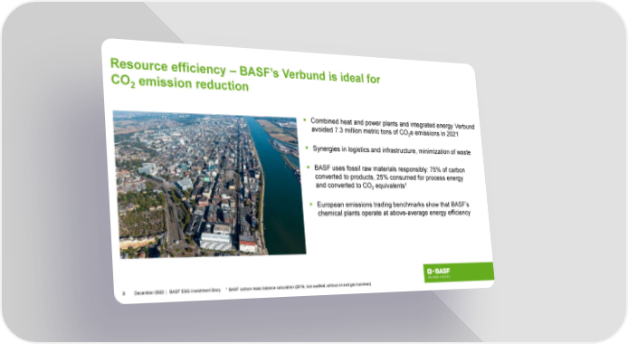 Resource efficiency – BASF’s Verbund is ideal for CO emission reduction 2 Combined heat and power plants and integrated energy Verbund avoided 7.3 million metric tons of CO e emissions in 2021 2 Synergies in logistics and infrastructure, minimization of waste BASF uses fossil raw materials responsibly: 75% of carbon converted to products, 25% consumed for process energy and converted to CO equivalents1 2 European emissions trading benchmarks show that BASF’s chemical plants operate at above-average energy efficiency 3 December2022 | BASF ESG Investment Story 1 BASF carbon mass balance calculation (2019, non-audited, without oil and gas business)