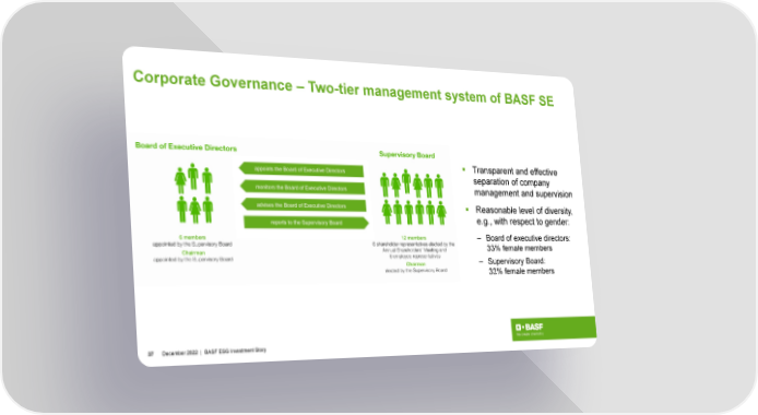 Corporate Governance – Two-tier management system of BASF SE appoints the Board of Executive Directors Transparent and effective separation of company monitors the Board of Executive Directors management and supervision advises the Board of Executive Directors Reasonable level of diversity, reports to the Supervisory Board e.g., with respect to gender: – Board of executive directors: 33% female members – Supervisory Board: 33% female members 37 December2022 | BASF ESG Investment Story