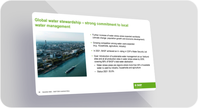 Global water stewardship – strong commitment to local water management Further increase of water stress areas expected worldwide (climate change, population growth and economic development) Growing competition among water users expected (e.g., households, agriculture, industry) In 2021, BASF achieved an A- rating in CDP’s Water Security List Goal: Introduction of sustainable water management at our Verbund sites and at all production sites in water stress areas by 2030, covering 89% of BASF’s total water abstraction – Water stress areas are regions where more than 40% of available water is used by industry, households and agriculture – Status 2021: 53.5% 33 December2022 | BASF ESG Investment Story