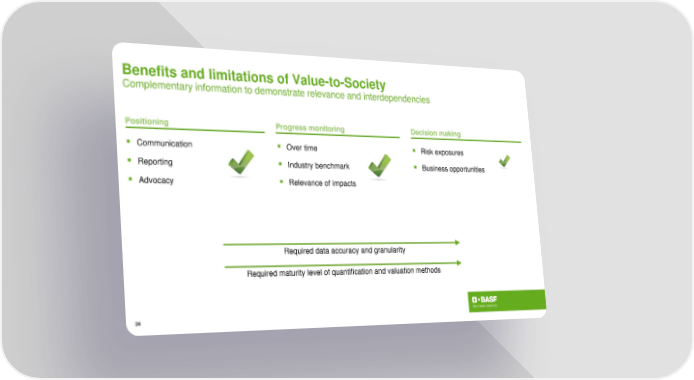 Benefits and limitations of Value-to-Society Complementary information to demonstrate relevance and interdependencies Positioning Progress monitoring Decision making Communication Over time Risk exposures Reporting Industry benchmark Business opportunities Advocacy Relevance of impacts Required data accuracy and granularity Required maturity level of quantification and valuation methods 24