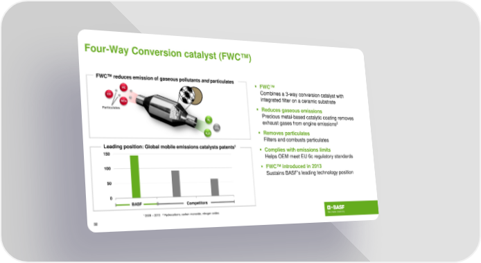Four-Way Conversion catalyst (FWC™) FWC™reduces emission of gaseous pollutants and particulates FWC™ HC Combines a 3-way conversion catalyst with CO integrated filter on a ceramic substrate NOx Reduces gaseous emissions Particulates Precious metal-based catalytic coating removes N 2 exhaust gases from engine emissions2 CO2 Removes particulates HO 2 Filters and combusts particulates 1 Leading position: Global mobile emissions catalysts patents Complies with emissions limits 150 Helps OEM meet EU 6c regulatory standards 100 FWC™introduced in 2013 Sustains BASF’s leading technology position 50 0 BASF Competitors 1 2009 – 2013 2 Hydrocarbons, carbon monoxide, nitrogen oxides 32