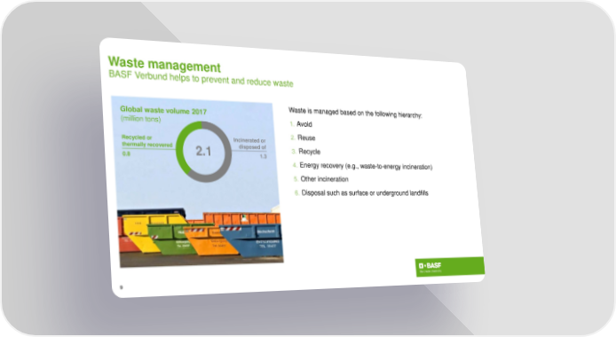 Waste management BASF Verbundhelps to prevent and reduce waste Global waste volume 2017 Waste is managed based on the following hierarchy: (million tons) 1. Avoid Recycled or Incinerated or 2. Reuse thermally recovered 2.1 disposed of 3. Recycle 0.8 1.3 4. Energy recovery (e.g., waste-to-energy incineration) 5. Other incineration 6. Disposal such as surface or underground landfills 9