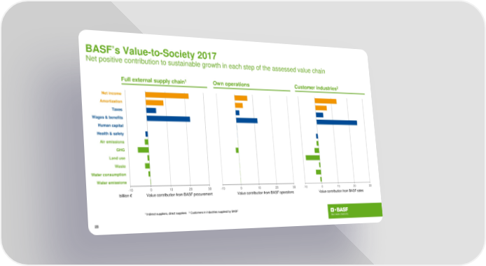 BASF’s Value-to-Society 2017 Net positive contribution to sustainable growth in each step of the assessed value chain 1 2 Full external supply chain Own operations Customer industries Net income Amortization Taxes Wages & benefits Human capital Health & safety Air emissions GHG Land use Waste Water consumption Water emissions -10 0 10 20 30 -10 0 10 20 30 -10 0 10 20 30 billion € Value contribution from BASF procurement Value contribution from BASF operations Value contribution from BASF sales 1 2 Indirect suppliers, direct suppliers Customers in industries supplied by BASF 23