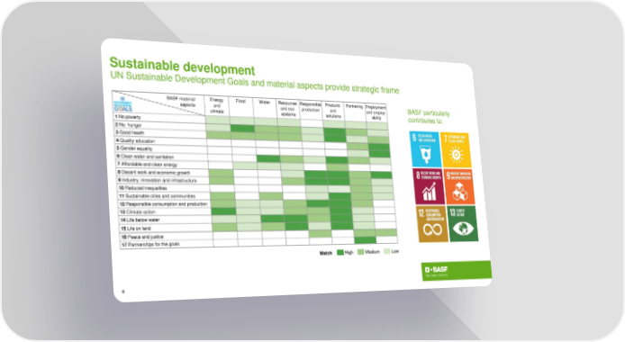 Sustainable development UN Sustainable Development Goals and material aspects provide strategic frame BASF material Energy Food Water Resources Responsible Products Partnering Employment BASF particularly aspects and and eco- production and and employ- climate systems solutions ability contributes to: 1No poverty 2No hunger 3Good health 4Quality education 5Genderequality 6Clean water and sanitation 7Affordable and clean energy 8Decent work and economic growth 9Industry, innovation and infrastructure 10 Reduced inequalities 11 Sustainable cities and communities 12 Responsible consumption and production 13 Climate action 14 Life below water 15 Life on land 16 Peace and justice 17 Partnerships for the goals Match High Medium Low 4