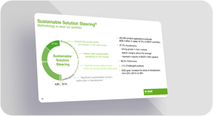 ® Sustainable Solution Steering Methodology to steer our portfolio >60,000 product applications analyzed Substantial sustainability (€58.4 billion in sales, 97.5% of BASF’s portfolio) 27.3% contribution in the value chain 27.3% Accelerators −strong growth in their markets Meets basic sustainability −deliver margins above the average standards on the market −represent majority of BASF’s R&D pipeline 68.3% 68.3% Performers Specific sustainability issues <1% Challenged products which are being actively addressed 2020 goal: increase the share of Accelerators from 23% (2014) to 28% Significant sustainability concern, action plan in development 4.3% 0.1% 16