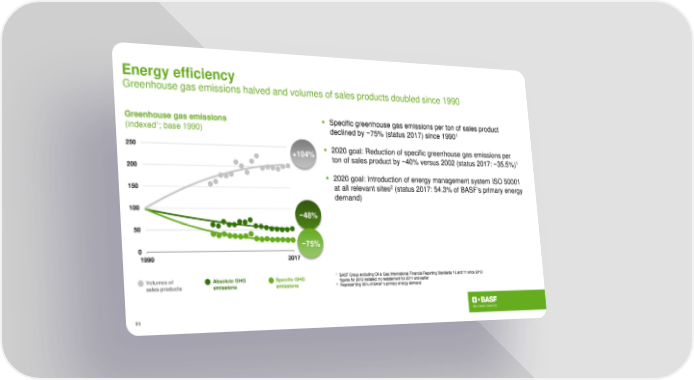Energy efficiency Greenhouse gas emissions halved and volumes of sales products doubled since 1990 Greenhouse gas emissions Specific greenhouse gas emissions per ton of sales product 1 1 (indexed ; base 1990) declined by −75% (status 2017) since 1990 250 +104% 2020 goal: Reduction of specific greenhouse gas emissions per 1 ton of sales product by −40% versus 2002 (status 2017: −35.5%) 200 2020 goal: Introduction of energy management system ISO 50001 150 at all relevant sites2 (status 2017: 54.3% of BASF’s primary energy demand) 100 −48% 50 0 −75% 1990 2017 Volumes of Absolute GHG Specific GHG 1 BASF Group excluding Oil & Gas; International Financial Reporting Standards 10 and 11 since 2013; figures for 2012 restated; no restatement for 2011 and earlier sales products emissions emissions 2 Representing 90% of BASFʼsprimary energy demand 11