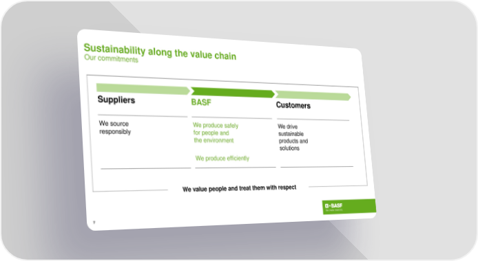 Sustainability along the value chain Our commitments Suppliers BASF Customers Wesource Weproducesafely Wedrive responsibly for people and sustainable the environment products and solutions Weproduceefficiently Wevalue peopleand treat them with respect 7