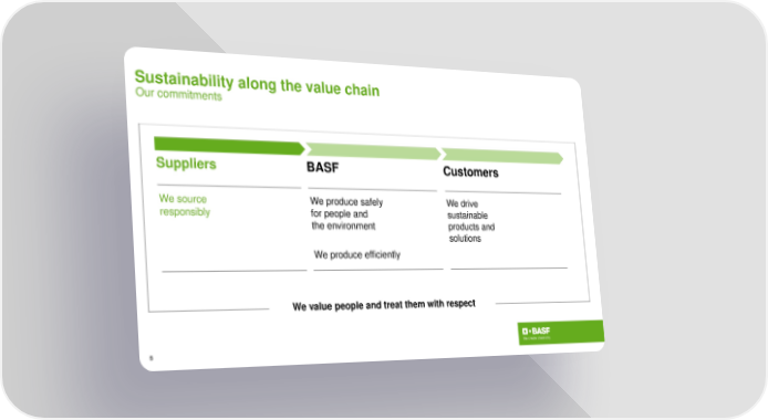 Sustainability along the value chain Our commitments Suppliers BASF Customers Wesource Weproducesafely Wedrive responsibly for people and sustainable the environment products and solutions Weproduceefficiently Wevalue peopleand treat them with respect 5