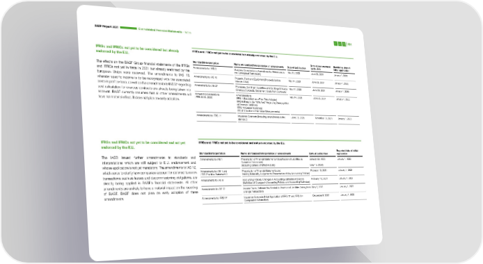 BASF Report 2021 Consoli dated Financial Statements – Notes 201 IFRSs and IFRICs not yet to be considered but already IFRSs and IFRICs not yet to be considered but already endorsed by the E.U. endorsed by the E.U. Date of endorsement Mandatory date of Standard/interpretation Name of standard/interpretation or amendments Date of publication by the E.U. initial application The effects on the BASF Group financial statements of the IFRSs Amendments to IFRS 3 Business Combinations (Amendment to References to May 14, 2020 June 28, 2021 January 1, 2022 and IFRICs not yet in force in 2021 but already endorsed by the the Conceptual Framework) European Union were reviewed. The amendments to IAS 16, Amendments to IAS 16 Property, Plant and Equipment (Proceeds before May 14, 2020 June 28, 2021 January 1, 2022 whereby specific income is to be recognized with the associated Intended Use) costs in profit or loss, as well as the amendments to IAS 37 regarding Amendments to IAS 37 Provisions, Contingent Liabilities and Contingent Assets May 14, 2020 June 28, 2021 January 1, 2022 cost calculation for onerous contracts are already being taken into (Onerous Contracts, Settlement Costs from Contracts) account. BASF currently assumes that all other amendments will Annual improvements to Amendments to May 14, 2020 June 28, 2021 January 1, 2022 have no material effect. It does not plan on early adoption. IFRS 2018–2020 IFRS 1 (Subsidiary as a First-Time Adopter) IFRS 9 (Fees in the “10% Test” Regarding Derecognition of Financial Liabilities) IFRS 16 (Lease Incentives) IAS 41 (Taxation in Fair Value Measurements) Amendments to IFRS 17 Insurance Contracts (including amendments to the June 25, 2020 November 19, 2021 January 1, 2023 standard) IFRSs and IFRICs not yet to be considered and not yet IFRSs and IFRICs not yet to be considered and not yet endorsed by the E.U. endorsed by the E.U. Expected date of initial Standard/interpretation Name of standard/interpretation or amendments Date of publication application The IASB issued further amendments to standards and Amendments to IAS 1 Presentation of Financial Statements (Classification of Liabilities as January 23, 2020 January 1, 2023 inter pretations which are still subject to E.U. endorsement and Current or Noncurrent) whose application is not yet mandatory. The amendments to IAS 12, (including Deferral of Effective Date) (July 15, 2020) which serve to clarify how companies account for deferred taxes on Amendments to IAS 1 and Presentation of Financial Statements and February 12, 2021 January 1, 2023 transactions such as leases and decommissioning obligations, are IFRS Practice Statement 2 Making Materiality Judgements (Presentation of Key Accounting Policies) already being applied in BASF’s financial statements. All other Amendments to IAS 8 Accounting Policies, Changes in Accounting Estimates and Errors February 12, 2021 January 1, 2023 (Definition of Changes in Accounting Policies and Accounting Estimates) amendments are unlikely to have a material impact on the reporting Amendments to IAS 12 Income Taxes (Deferred Tax Related to Assets and Liabilities Arising from May 7, 2021 January 1, 2023 of BASF. BASF does not plan on early adoption of these a Single Transaction) amendments. Amendments to IFRS 17 Insurance Contracts (Initial Application of IFRS 17 and IFRS 9 – December 9, 2021 January 1, 2023 Comparative Information)