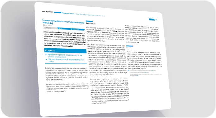BASF Report 2021 Management’s Report – Product Stewardship for Crop Protection Products and Seeds 124 Product Stewardship for Crop Protection Products Crop protection We also work closely together with associations such as CropLife and Seeds International and CropLife Europe to promote the safe and proper GRI 102, 103, 416, 417 BASF adheres to the International Code of Conduct issued by the use of crop protection products. For example, we support steward- SUPPLIERS BASF CUSTOMERS World Health Organization (WHO) and the Food and Agriculture ship initiatives of both associations and various programs on the Organization (FAO) for the distribution of crop protection products. proper disposal and recycling of product containers. Technological Crop protection products and seeds are highly regulated at These are only marketed once they have been approved by the rele- innovations developed together with industry partners such as the national and international level, which brings with it strict vant authorities. We no longer sell WHO Class 1A or 1B products easyconnect closed transfer system in Europe or the Wisdom sys- requirements for registering and re-registering active ingre- (high acute oral and dermal toxicity). Depending on availability, we tem in South America also help to make using crop protection dients and crop systems. Regulatory approval is only granted offer our customers alternatives. products easier and safer. when extensive documentation can be provided showing that our products are safe for people, animals and the environ- All of BASF’s crop protection products can be used safely under ment when used in the manner intended. local farming conditions if the information and directions on the label Seeds are followed. Customers can contact us directly if they have any At a glance questions, complaints or issues, for example, by calling the tele- BASF is a member of Excellence Through Stewardship, a global phone number printed on product labels, using the contact forms industry initiative for seeds. This initiative promotes the adoption of ▪ High regulatory requirements and safety standards for crop on our websites or by approaching our sales employees directly. We quality management systems for seeds and product stewardship protection products and seeds record all products incidents relating to health or the environment programs covering the entire life cycle. It also has independent ▪ Wide range of training on the safe and proper handling of our that come to our attention in a global database. If necessary, we ETS-certified auditors verify members’ compliance with its guide- products take appropriate measures on the basis of this information, such as lines. In 2021, BASF successfully passed ETS audits in the areas of updating the instructions for use on the product label to minimize laboratory operations, contained biotech plants, general steward- preventable incidents in the future. We communicate changes to ship, incident response management and product handling at our Potential risks are assessed and minimized throughout the research, instructions for use and general recommendations on the safe use Ghent and Astene sites in Belgium. development and registration process, and on an ongoing basis of our products through channels such as our Farmer Field School For more information on our Agricultural Solutions segment, see page 88 onward following market registration. We regularly perform a large number initiatives in Asia and in training programs such as the On Target For more information on biodiversity, see page 138 onward of scientific studies and tests to ensure that, as far as possible, our Application Academy in the United States. For more information on risks from litigation and claims, see the Notes to the Consolidated Financial registration dossiers address all questions on potential environ- Statements on page 262 mental and health effects. One of the ways we meet our commitment to product stewardship is by offering a wide range of courses and training on the safe We adapt our portfolio to the specific requirements of regional mar- storage and safe use of our products. In India, for example, BASF kets as crops, soils, climate conditions, plant diseases and farming launched the Suraksha Hamesha program. Suraksha Hamesha practices vary around the world. Consequently, product approvals means “safety all the time.” The program creates a platform for edu- differ from country to country. cating farmers and agricultural workers about the nine steps of responsible use of crop protection products and personal protec- tion. Through Suraksha Hamesha, BASF has engaged with over 162,600 agricultural workers and around 33,200 users across India since 2016. BASF also involves government agencies and the cen- tral government’s farm extension teams in these meetings to support and promote farm safety.