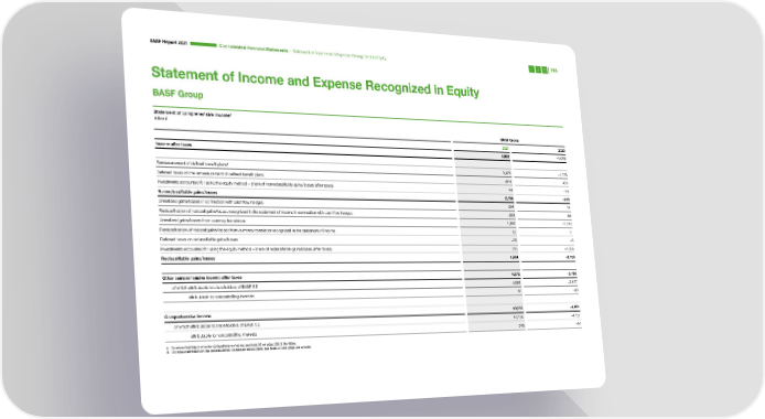 BASF Report 2021 Consoli dated Financial Statements – Statement of Income and Expense Recognized in Equity 195 Statement of Income and Expense Recognized in Equity BASF Group a Statement of comprehensive income Million € BASF Group 2021 2020 Income after taxes 5,982 –1,075 Remeasurement of defined benefit plansb 3,476 –1,376 Deferred taxes on the remeasurement of defined benefit plans –811 422 Investments accounted for using the equity method – share of nonreclassifiable gains/losses (after taxes) 44 –19 Nonreclassifiable gains/losses 2,709 –973 Unrealized gains/losses in connection with cash flow hedges 284 14 Reclassification of realized gains/losses recognized in the statement of income in connection with cash flow hedges –222 65 Unrealized gains/losses from currency translation 1,566 –1,612 Reclassification of realized gains/losses from currency translation recognized in the statement of income 52 71 Deferred taxes on reclassifiable gains/losses –29 –5 Investments accounted for using the equity method – share of reclassifiable gains/losses (after taxes) 313 –1,286 Reclassifiable gains/losses 1,964 –2,753 Other comprehensive income after taxes 4,673 –3,726 of which attributable to shareholders of BASF SE 4,583 –3,677 attributable to noncontrolling interests 90 –49 Comprehensive income 10,655 –4,801 of which attributable to shareholders of BASF SE 10,106 –4,737 attributable to noncontrolling interests 549 –64 a For more information on other comprehensive income, see Note 20 on page 250 of the Notes b For more information on the remeasurement of defined benefit plans, see Note 22 from page 254 onward