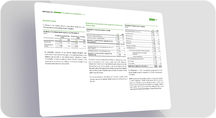 BASF Report 2021 Consoli dated Financial Statements – Notes 257 Sensitivity analysis Explanation of the amounts in the statement of income and Development of defined benefit obligations balance sheet Million € A change in the material actuarial assumptions would have the 2021 2020 following effects on the defined benefit obligation: Composition of expenses for pension benefits Defined benefit obligation as of January 1 29,840 28,423 Million € Current service cost 419 419 Sensitivity of the defined benefit obligation as of December 31 2021 2020 Past service cost 1 6 Million € Expenses for defined benefit plans 423 430 Increase by 0.5 percentage Decrease by 0.5 percentage Plan settlements –21 –60 points points Expenses for defined contribution plans 308 306 Interest cost 276 395 2021 2020 2021 2020 Expenses for pension benefits (recognized in income 731 736 from operations) Benefits paid –1,084 –1,095 Discount rate –2,115 –2,221 2,420 2,553 Employee contributions 37 41 Projected pension 1,533 1,666 –1,267 –1,411 Net interest expense from underfunded pension plans and Actuarial gains/losses –1,496 2,131 increase similar obligations 85 108 of which adjustments relating to financial assumptions –1,505 2,106 Net interest income from overfunded pension plans –3 0 adjustments relating to demographic An alternative valuation of the defined benefit obligation was Expenses for pension benefits (recognized in the assumptions –117 8 financial result) 82 108 performed to determine how changes in the underlying assumptions experience adjustments 126 17 influence the amount of the defined benefit obligation. A linear Effects from acquisitions and divestitures 171 54 extrapolation of these amounts based on alternative changes in the The interest on the net defined benefit liability at the beginning of the Other changes –19 –4 assumptions as well as an addition of combined changes in the year is recognized in the financial result. This is the difference individual assumptions is not possible. between the interest cost of the defined benefit obligation and the Currency effects 505 –470 standardized return on plan assets as well as the interest cost for Defined benefit obligation as of December 31 28,629 29,840 the asset ceiling. The expected contribution payments and benefits paid over the course of the fiscal year are taken into account when As of December 31, 2021, the weighted average duration of the determining net interest. defined benefit obligation amounted to 16.6 years (previous year: 16.6 years). Net interest expense of the respective fiscal year is based on the discount rate and the defined benefit obligation at the beginning of BASF tendered and reissued the mandate for the actuarial valuation the year. of indirect obligations at BASF Pensionskasse VVaG and of direct obligations of the German group, effective as of May 1, 2021. In this context, some of the previous assumptions and valuation methods were modified. This led to actuarial losses totaling €8 million, which were included in adjustments relating to financial assumptions.