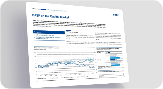 BASF Report 2021 To Our Shareholders – BASF on the Capital Market 12 BASF on the Capital Market In 2021, the stock markets were characterized by a significant recovery of the global economy. This was due in particular to the approval and increasing availability of effective coronavirus vaccines. BASF stands by its ambitious dividend policy and will propose a dividend of €3.40 per share to the Annual Shareholders’ Meeting – an increase of 10 euro cents compared with the previous year. Based on the year-end share price for 2021, BASF shares offer a high dividend yield of around 5.5%. At a glance BASF share performance positive business performance. This was due to factors such as the composition of the segments’ earnings contributions. Share price ▪ BASF share price declines 4.5% in 2021 The BASF share closed the 2021 stock market year at €61.78, a development was also negatively impacted by market expectations ▪ Assuming that dividends were reinvested, BASF’s share decrease of 4.5% compared with the previous year’s closing price regarding the future development of margins in the basic chemicals performance rose by 0.2% (€64.72). business. BASF’s share price reached an annual high of €72.61 in March Assuming that dividends were reinvested, BASF’s share perfor- 2021 before declining over the course of the year despite continued mance rose by 0.2% in 2021. The benchmark indexes of the Change in value of an investment in BASF shares in 2021 Long-term performance of BASF shares compared with indexes With dividends reinvested; indexed Average annual increase with dividends reinvested 140 140 2016–2021 –2.4% 6.7% 130 130 8.0% 12.3% 120 120 2011–2021 5.7% 110 110 10.4% 8.9% 100 100 12.1% ▪ ▪ ▪ ▪ BASF share DAX 40 EURO STOXX 50 MSCI World Chemicals 90 90 80 80 Weighting of BASF shares in important indexes as of December 31, 2021 Jan Feb Mar Apr May Jun Jul Aug Sep Oct Nov Dec DAX 40 4.0% BASF share 0.2% DAX 40 15.8% EURO STOXX 50 23.3% MSCI World Chemicals 21.7% EURO STOXX 50 1.8% MSCI World Chemicals 4.6%