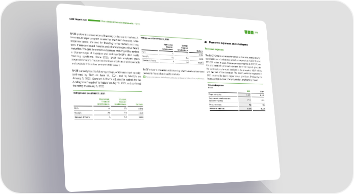 BASF Report 2021 Consoli dated Financial Statements – Notes 279 BASF prefers to access external financing on the capital markets. A Ratings as of December 31, 2020 28 Personnel expenses and employees commercial paper program is used for short-term financing, while Noncurrent Current corporate bonds are used for financing in the medium and long financial financial Personnel expenses term. These are issued in euros and other currencies with different indebtedness indebtedness Outlook maturities. The goal is to create a balanced maturity profile, achieve Fitch A F1 stable The BASF Group’s expenses for wages and salaries, social security a diverse range of investors and optimize BASF’s debt capital Moody’s A3 P-2 stable contributions and assistance, as well as for pensions in 2021 totaled financing conditions. Since 2020, BASF has employed green Standard & Poor’s A A-1 negative €11,097 million. In 2020, these expenses amounted to €10,576 mil- corporate bonds to finance the development of sustainable products lion and included personnel expenses from the disposal group for and projects with a clear environmental benefit. the construction chemicals business in the amount of €291 million BASF strives to maintain a solid A rating, which ensures unrestricted until the date of the divestiture. The rise in personnel expenses in BASF currently has the following ratings, which were most recently access to financial and capital markets. 2021 was mainly due to higher bonus provisions. Particularly the confirmed by Fitch on June 11, 2021, and by Moody’s on For more information on BASF’s financing policy, see the Management’s Report from page 64 onward lower average number of employees had an offsetting impact. January 5, 2022. Standard & Poor’s adjusted its outlook for the A rating from “negative” to “stable” on July 16, 2021, and confirmed Personnel expenses the rating on January 6, 2022. Million € 2021 2020 Ratings as of December 31, 2021 Wages and salaries 8,847 8,416 Social security contributions and 1,519 1,424 Noncurrent Current assistance expenses financial financial indebtedness indebtedness Outlook Pension expenses 732 736 Fitch A F1 stable Personnel expenses 11,097 10,576 Moody’s A3 P-2 stable Standard & Poor’s A A-1 stable