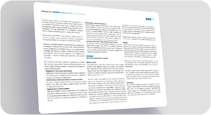 BASF Report 2021 Management’s Report – Opportunities and Risks 154 An internal control system for financial reporting continuously moni- – Monitoring of control weaknesses macroeconomic risks result from the escalation of other geopolitical tors these principles. To this end, methods are provided to ensure The responsible managers receive reports on any control weak- conflicts and a renewed intensification of the trade conflict between that evaluation of the internal control system in financial reporting is nesses identified and their resolution; and an interdisciplinary the United States and China. Both can have a considerable impact structured and uniform across the BASF Group. They also work in committee investigates their relevance to the BASF Group. The on global demand for intermediate goods for industrial production accordance with the international risk management standard, Board of Executive Directors and the Audit Committee are and demand for investment goods. COSO II Enterprise Risk Management – Integrated Framework. informed if control weaknesses with a considerable impact on financial reporting are identified. Only after material control weak- Weather-related influences can result in positive or negative effects Material risks for the BASF Group regarding a reliable control envi- nesses have been resolved does the company’s managing direc- on our business, particularly in the Agricultural Solutions segment. ronment for proper financial reporting are reviewed and updated on tor confirm the effectiveness of the internal control system. an annual basis. Risks are compiled into a central risk catalog. – Internal confirmation of the internal control system Margins All managing directors and chief financial officers of each consoli- Opportunities and risks for the BASF Group primarily result from Moreover, a centralized selection process identifies companies that dated Group company must confirm to the Board of Executive higher or lower margins in the Chemicals and Materials segments. are exposed to particular risks, that are material to the Consolidated Directors of BASF SE every half-year and at the end of the annual Opportunities arise here if the positive margin trend continues for Financial Statements of the BASF Group, or that provide service cycle, in writing, that the internal control system is effective with longer than expected. However, further increases in energy and raw processes. The selection process is conducted annually. Persons regard to accounting and reporting. materials prices in particular, new capacities and raw materials responsible for implementing the requirements for an effective con- shortages could increase margin pressure on a number of products trol system in financial reporting are appointed at the relevant and value chains. This would have a negative effect on our EBIT. companies. Operational opportunities and risks Moreover, if oil and gas prices rise, Wintershall Dea does not have The process for identifying, evaluating, managing and controlling Market growth a compensating effect on the BASF Group’s EBIT because this risks related to preparing the Consolidated Financial Statements as The development of our sales markets is one of the strongest shareholding is no longer reported in EBIT, but in net income from well as monitoring these processes in the selected companies com- sources of opportunities and risks. For more details on our assump- shareholdings. prises the following steps: tions regarding short-term growth rates for the global economy, – Evaluation of the control environment regions and key customer industries, such as the chemicals, auto- The year’s average oil price for Brent crude was $71 per barrel in Adherence to internal and external guidelines that are relevant to motive and construction sectors, see Economic Environment in 2021, compared with $42 per barrel in the previous year. For 2022, the maintenance of a reliable control environment is checked by 2022 on pages 145 to 147. we anticipate an average oil price of $75 per barrel. We therefore means of a standardized questionnaire. expect price levels for the raw materials and petrochemical basic – Identification and documentation of control activities We also consider opportunities and risks caused by deviations in products that are important to our business to rise. In order to mitigate the risks to the financial reporting processes assumptions. Stronger demand resulting from faster eradication of listed in our central risk catalog, critical processes and control the coronavirus pandemic, for example through sustained efficacy Competition activities are documented. and growing acceptance of coronavirus vaccines and drugs, will We continuously enhance our products and solutions in order to – Assessment of control activities give rise to macroeconomic opportunities. A significant macro- maintain competitive ability. We monitor the market and the compe- After documentation, a review is performed to verify whether the economic risk arises from the possibility that measures to contain tition, and try to take targeted advantage of opportunities and described controls are capable of adequately covering the risks. the coronavirus are kept in place for a longer period of time or aug- counter emerging risks with suitable measures. Aside from inno- In the subsequent test phase, spot checks are carried out to test mented, and, as a result, negatively affect global supply chains and vation, key components of our competitiveness are our ongoing whether, in practice, the controls were executed as described and slow global economic growth. Further increases in energy prices, cost management and continuous process optimization. effective. caused, for example by an escalation of the conflict between Russia and Ukraine, and the resulting higher inflation rates for manufacturer and consumer prices also pose a risk to the economy. Additional