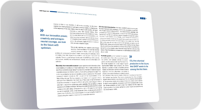 BASF Report 2021 To Our Shareholders – Letter from the Chairman of the Board of Executive Directors 9 courage to think in new directions. It will involve converting the big steam CO -free chemical production is the future. And BASF wants to be among the 2 crackers from heating based on fossil fuels to electrical heating. In these plants, first there. It all starts with transparency, which is why we provide our custom ers at the beginning of the value chains, steam is used to split naphtha into basic with Product Carbon Footprints (PCF) – the carbon footprint associated with chemicals at about 850 degrees Celsius. Other production per kilogram of sales product – for each of our 45,000 sales products. examples include the CO -free production of hydro- Furthermore, we help our customers develop strategies to reduce their carbon » 2 With our innovation power, gen by water electrolysis and methane pyrolysis, and footprint, to use resources more efficiently, and to manufacture products in a using waste heat recovered with heat pumps instead more environmentally friendly way. We expect that demand for such emission-free crea tivity and entre pre of con ven tional steam generation in gas-fired power or emission-reduced products will exceed supply in the medium term, and that neurial courage, we look plants. We will invest roughly €4 billion to reach our their market value will more than compensate for the higher production costs. It 2030 emission reduction targets. therefore also makes good economic sense to take a leading role here. That is to the future with why we want to be among the first to provide as many products as possible from optimism. We are also redefining raw material cycles through our portfolio with a reduced carbon footprint in large volumes by the end of the recycling. Good examples of this are the chemical decade. This differentiates us, increases our competitiveness and enables growth recycling process in which a new raw material, above market. pyrolysis oil, is obtained from plastic waste; the recycling of mattresses, which are broken down into polyurethane precursors; and the use of bio-based raw Profitable growth lays the foundation for a success- materials. There is a great feeling of excitement in the BASF team! With our inno- ful transformation. This is why we continue to focus » vation power, creativity and entrepr eneurial courage, we look to the future with our portfolio and business activities on organic CO free chemical optimism. growth. And the reverse is also true: The transforma - 2 tion is the foundation for a wide range of growth production is the future. Electricity from renewable sources in great quantities and at favorable prices opportunities! Neither future prosperity nor climate And BASF wants to be would enable us to achieve a climate-neutral future. This is made possible by the neutrality is possible without a competitive chemical electrification of entire value chains. To achieve this, we need to massively expand industry and innovative chemical products. Extensive among the first there . renewable energies worldwide. Currently, this is not happening fast enough. That regulations driven by policymakers and society do is why we are leading the way and securing access to green power. We already present a tremendous challenge to industry in general announced several projects in 2021 as part of the implementation of our and particularly to the chemical industry. At the same time, however, they lead to Make & Buy strategy: We have secured a half share in a 1.5 gigawatt offshore new business opportunities. The dynamic development from the combustion wind park from Vattenfall in the North Sea off the coast of the Netherlands. It engine to electromobility is a good example of this. As a leading chemical supplier should be connected to the grid in 2023. It will be the world’s biggest offshore to the automotive industry and producer of innovative cathode active materials wind farm – and all this without any public subsidies. We are taking a different for electric vehicle batteries, we are able to profit from this development. Growth approach with Ørsted and Engie: We have concluded attractive electricity supply and climate protection go hand in hand: Our materials not only support the contracts with both energy companies for a term of 25 years. In other regions dynamic growth of this market, but their low carbon footprint also paves the way as well, for example, in the United States and China, we are securing access to for climate-neutral mobility. green power. In this way, we are planning proactively and laying the foundation to ensure a long-term supply of electricity from renewable resources.
