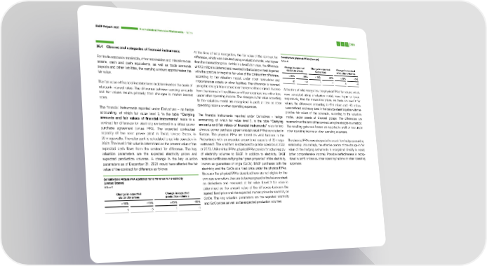 BASF Report 2021 Consoli dated Financial Statements – Notes 269 26.4 Classes and categories of financial instruments At the time of initial recognition, the fair value of the contract for Sensitivities physical PPAs (Europe) difference, which was calculted using a valuation model, was higher Million € For trade accounts receivable, other receivables and miscellaneous than the transaction price. As this is a level 3 fair value, the difference Change in expected Change in expected Change in expected assets, cash and cash equivalents, as well as trade accounts of €12 million is deferred and reported in the balance sheet together electricity prices GoO prices production volumes payable and other liabilities, the carrying amount approximates the with the positive or negative fair value of the contract for difference, +10% –10% +10% –10% +10% –10% fair value. according to the valuation model, under other receivables and 42 –42 1 –1 8 –8 miscellaneous assets or other liabilities. The difference is reversed The fair value of financial indebtedness is determined on the basis of using the straight-line method over the term of the contract. Income At the time of initial recognition, the physical PPAs’ fair values, which interbank interest rates. The difference between carrying amounts from the reversal of the difference will be recognized in profit or loss were calculated using a valuation model, were higher or lower, and fair values results primarily from changes in market interest under other operating income. The changes in fair value according respectively, than the transaction prices. As these are level 3 fair rates. to the valuation model are recognized in profit or loss as other values, the differences amounting to €14 million and –€5 mil lion operating income or other operating expenses. were deferred and recognized in the balance sheet together with the The financial instruments reported under Derivatives – no hedge positive fair values of the contracts, according to the valuation accounting, of which fair value level 3, in the table “Carrying The financial instruments reported under Derivatives – hedge model, under assets of disposal groups. The differences are amounts and fair values of financial instruments” relate to a accounting, of which fair value level 3, in the table “Carrying reversed over the term of the contract using the straight-line method. contract for difference for electricity embedded in a virtual power amounts and fair values of financial instruments” relate to two The resulting gains and losses are reported in profit or loss under purchase agreement (virtual PPA). The expected contractual physical power purchase agreements (physical PPAs) concluded in other operating income or other operating expenses. capacity of the solar power plant in Texas, United States, is Europe. The physical PPAs are based on wind turbines in the 50 mega watts. The solar park is scheduled to go into operation in Netherlands with an expected proportional capacity of 35 mega- The physical PPAs were designated in a cash flow hedge accounting 2023. The level 3 fair value is determined as the present value of the watts each. The wind farm is scheduled to go into operation in 2022 relationship. Accordingly, the effective portion of the change in fair expected cash flows from the contract for difference. The key or 2023. Unlike virtual PPAs, physical PPAs provide for actual supply value of the hedging instruments is recognized directly in equity valuation parameters are the expected electricity prices and of electricity volumes to BASF. In addition to electricity, BASF (other comprehensive income). Possible ineffectiveness is recog- expected production volumes. A change in the key valuation receives certificates verifying the “green properties” of the electricity, nized in profit or loss as other operating income or other operating parameters as of December 31, 2021 would have af fected the fair known as guarantees of origin (GoOs). BASF pur chases both the expenses. value of the contract for difference as follows: electricity and the GoOs at a fixed price under the physical PPAs. Because the physical PPAs described here are not eligible for the Sensitivities virtual PPA contract for difference for electricity own use exemption, they are to be recognized in the balance sheet (United States) as derivatives and measured at fair value. Level 3 fair value is Million € determined as the present value of the difference between the Change in expected Change in expected agreed fixed price and the expected market prices for electricity or electricity prices production volumes GoOs. The key valuation parameters are the expected electricity +10% –10% +10% –10% and GoO prices as well as the expected production volumes. 5 –5 1 –1