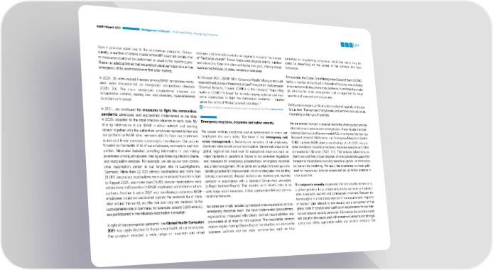 BASF Report 2021 Management’s Report – Health and Safety, Emergency Response 121 than in previous years due to the coronavirus pandemic. Conse- seminars and interactive events on regeneration under the banner authorities or neighboring companies. Additional teams may be quently, a number of criteria crucial to the HPI could not be fully met of “Recharge yourself.” Focus topics were physical activity, nutrition called in depending on the extent of the damage and how or measures could not be performed as usual in the reporting year. and relaxation. Over 444 sites worldwide took part, offering events it develops. These included activities that required physical participation such as such as workshops, courses, lectures or exercises. emergency drills, examinations or first aider training. For example, the Global Crisis Management Support Team (GCMS), In October 2021, BASF SE’s Corporate Health Management unit led by a member of the Board of Executive Directors, was activated ® Award from the European In 2021, 36 work-related illnesses among BASF employees world- received the European Responsible Care in connection with the coronavirus pandemic. It provides the strate- wide were documented as recognized occupational diseases Chemical Industry Council (CEFIC) in the category “Supporting gic direction for crisis management and is supported by issue- (2020 : 26). The main recognized occupational diseases are health in COVID-19 times” for its wide-ranging activities and inno- specific and specialist working groups. occupational asthma, hearing loss, skin diseases, musculoskeletal vative approaches to fight the coronavirus pandemic – bundled disorders and cancer. under the motto of “Protect yourself and others.” Safety and emergency drills are also conducted regularly at site and For more information on occupational medicine, health campaigns and the HPI, see basf.com/health Group level. The number of employees and partners involved varies In 2021, we continued the measures to fight the coronavirus depending on the type of exercise. pandemic developed and successfully implemented at our sites in 2020, adapted to the local infection situation in each case. By Emergency response, corporate and cyber security We are actively involved in external networks, which quickly provide sharing information in our BASF medical network and working information and assistance in emergencies. These include the Inter- closely together with the authorities, employee representatives and We create working conditions and an environment in which our national Chemical and Environmental (ICE) initiative and the German our partners at BASF sites, we were able to make and implement employees can work safely. The focus of our emergency and Transport Accident Information and Emergency Response System sound and timely decisions according to the situation. Our actions crisis management is therefore on the safety of our employees, (TUIS), in which BASF plays a coordinating role. In 2021, we pro- focused on the health of all of our employees, contractors and third plants and sites as well as our communities. We are well prepared at vided assistance to public emergency response agencies and other parties. Measures included providing information to and raising global, regional and local level for exceptional situations such as companies in 138 cases (2020: 112). This included information on awareness among employees, tracing and breaking infection chains, major incidents or pandemics thanks to our extensive regulations chemicals and their proper disposal, on-site operational support for and vaccination services. For example, we set up our own corona- and measures for emergency preparedness, emergency response transportation accidents involving hazardous goods, or information virus vaccination center at our largest site in Ludwigshafen, and crisis management. All incidents are carefully followed up on to on human biomonitoring. We apply the experience we have gath- Germany. More than 22,000 primary vaccinations and more than identify potential for improvement, which is integrated into existing ered to improve our own processes and set up similar systems in 21,000 secondary vaccinations were administered there from April concepts as needed. Unusual incidents are recorded and reported other countries. to August 2021, and more than 10,000 booster vaccinations were centrally in accordance with a standard Group-wide procedure administered in December to BASF employees, contractors and site (e-Rapid Incident Report). This enables us to identify risks at an The corporate security requirements for site security are set out in partners. Another focus in 2021 was on influenza prevention. BASF early stage and, if necessary, initiate appropriate relief and commu- a global guideline. Local implementation by our sites and subsidi- employees could be vaccinated against the seasonal flu at many nication measures. aries is regularly audited and continuously improved. Respect for sites around the world, an offer that was very well received. At the human rights is a mandatory element of our requirements. Aspects Ludwigshafen site in Germany, for example, around 6,800 employ- Incidents are initially handled by the local crisis organization or local of human rights relevant to site security are a component of the ees participated in the influenza vaccination campaign. emergency response team. We have implemented precautionary global code of conduct and qualification requirements for our inter- organizational measures with clearly defined responsibilities and nal and external security personnel. We analyze the potential safety In light of the coronavirus pandemic, the Global Health Campaign procedures at all sites for this purpose. The responsible persons and security risks associated with investment projects and strategic 2021 was again devoted to the personal health of our employees. receive regular training. Depending on the situat