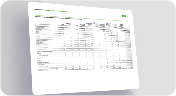 BASF Report 2021 Consoli dated Financial Statements – Notes 243 Development of property, plant and equipment including right-of-use assets arising from leases in 2020 Million € Right-of-use Right-of-use Advance Advance Machinery and machinery and Miscellaneous miscellaneous payments and payments Right-of-use Right-of-use technical technical equipment and equipment and construction in for right-of-use Land land Buildings buildings equipment equipment fixtures fixtures progress assets Total Cost As of January 1, 2020 950 440 10,757 808 43,783 399 4,808 551 3,006 6 65,508 Changes in the scope of consolidation 1 – – – – – 2 1 37 – 41 Additions 18 40 161 120 787 147 199 202 1,842 – 3,516 Additions from acquisitions 12 – 82 3 400 10 3 1 48 – 559 Disposals –3 –13 –129 –53 –590 –13 –145 –36 –216 – –1,198 Transfers 5 – 282 1 1,123 6 77 –1 –1,515 –6 –28 Transfers to disposal groups 3 –2 – –3 –34 – –4 –2 60 – 18 Currency effects –39 –14 –404 –42 –1,567 –44 –167 –26 –98 – –2,401 As of December 31, 2020 947 451 10,749 834 43,902 505 4,773 690 3,164 – 66,015 Accumulated depreciation As of January 1, 2020 53 65 6,374 144 33,110 144 3,472 196 158 – 43,716 Changes in the scope of consolidation – – – – – – 1 – – – 1 Additions 19 40 614 188 3,401 106 392 195 234 – 5,189 of which impairments 18 23 250 50 1,396 25 49 14 234 – 2,059 Disposals –2 –1 –112 –27 –546 –8 –135 –25 –214 – –1,070 Transfers – – –2 – 34 – –45 –1 –10 – –24 Transfers to disposal groups – – 2 2 7 – –1 3 10 – 23 Currency effects –4 –4 –187 –15 –1,124 –13 –108 –11 –1 – –1,467 As of December 31, 2020 66 100 6,689 292 34,882 229 3,576 357 177 – 46,368 Net carrying amount as of December 31, 2020 881 351 4,060 542 9,020 276 1,197 333 2,987 − 19,647