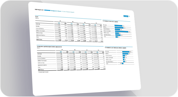 BASF Report 2021 Management’s Report – Business Review by Segment 70 Salesa Contributions to total sales by segment Million € Q1 Q2 Q3 Q4 2021 2020 2021 2020 2021 2020 2021 2020 Chemicals 17% Chemicals 2,736 2,350 3,419 1,791 3,693 1,783 3,731 2,147 Materials 19% Materials 3,447 2,874 3,743 2,143 3,973 2,657 4,052 3,062 Industrial Solutions 11% Industrial Solutions 2,108 2,098 2,359 1,819 2,205 1,844 2,204 1,883 Surface Technologies 29% Surface Technologies 5,947 4,328 5,892 3,099 5,631 4,142 5,189 5,090 Nutrition & Care 8% Nutrition & Care 1,533 1,582 1,584 1,555 1,598 1,427 1,727 1,455 Agricultural Solutions 11% Agricultural Solutions 2,846 2,819 1,963 1,766 1,593 1,474 1,760 1,601 Other 5% Other 783 702 793 507 976 484 1,113 667 '17 BASF Group 19,400 16,753 19,753 12,680 19,669 13,811 19,776 15,905 '16 '15 '14 Income from operations (EBIT) before special itemsa Contributions to EBIT before special items by segment Million € Q1 Q2 Q3 Q4 2021 2020 2021 2020 2021 2020 2021 2020 Chemicals 38% Chemicals 558 174 990 –2 850 46 576 227 Materials 31% Materials 672 209 792 –80 631 217 323 489 Industrial Solutions 13% Industrial Solutions 266 273 307 163 262 186 171 200 Surface Technologies 10% Surface Technologies 360 220 289 –151 119 200 32 215 Nutrition & Care 7% Nutrition & Care 218 254 138 256 104 143 37 120 Agricultural Solutions 9% Agricultural Solutions 807 809 75 120 –90 26 –77 15 Other –8% Other –560 –299 –236 –80 –11 –237 165 –153 BASF Group 2,321 1,640 2,355 226 1,865 581 1,227 1,113 a Quarterly results not audited