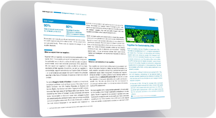 BASF Report 2021 Management’s Report – Supplier Management 110 2025 target electronic ordering systems and purchasing conditions across the Good to know Group. We revised our Supplier Code of Conduct in 2021 and 90% 80% added our expectations around the procurement of conflict minerals (tin, tantalum, tungsten, their ores and gold). Around 5,900 new Share of relevant spend covered Percentage of suppliers suppliers committed to the Code of Conduct in 2021. by sustainability evaluations with improved sustainability performance upon re-evaluation BASF conducts audits and assessments to ensure that suppliers reserves comply with the applicable laws, rules and standards. BASF We acquired raw materials, goods and services for our own produc- the right to discontinue business relationships for non-adherence to tion worth approximately €43.5 billion in 2021. Of this, around 90% international principles. The same applies to failure to correct viola- Together for Sustainability (TfS) 1 was procured locally. There were no substantial changes to our tions, or for displaying patterns of non-compliance with these stan- supplier structure. dards. Our Code of Conduct expressly points out that potential BASF is a founding member of Together for Sustainability (TfS). violations of laws, rules or standards can be reported – including The initiative was established in 2011 to improve sustainability in anonymously – to our compliance hotlines. Each case is docu- the supply chain. The focus is on standardizing and simplifying What we expect from our suppliers mented and investigated, and appropriate measures are taken as supplier audits and evaluations globally. This increases trans- necessary. parency and creates synergies: Suppliers only have to complete Together with our suppliers, we want to improve sustainability in the an assessment process once. The results are then made available supply chain. Consequently, we expect our suppliers to comply with to all TfS members and are mutually recognized – saving time and the applicable laws in full and to adhere to internationally recognized Selection and evaluation of our suppliers money for both parties. Suppliers are evaluated by independent environmental, social and corporate governance (ESG) standards. experts either in on-site audits or online assessments. The latter We also expect our suppliers to make an effort to enforce these New suppliers are selected and existing suppliers are evaluated not are conducted by EcoVadis, a ratings agency specialized in sus- standards at their suppliers. In addition, we ask our suppliers to only on the basis of economic criteria, but also ESG standards. As tainability analyses. acknowledge, support and abide by our Supplier Code of Conduct such, selection, evaluation and auditing is an important part of our – or to demonstrate and ensure their commitment to the principles sustainable supply chain management. Processes and responsi- A new program on Scope 3 emissions was launched in 2021. The specified in the Code of Conduct, for example in their own code of bilities are defined in a global guideline. Due to the large number of aim is to develop a methodology for the chemical industry to conduct. suppliers, they are evaluated based on risk. We take into account calculate upstream greenhouse gas emissions in particular. TfS the materiality of the supply relationship and country and industry- members can use this data to implement and manage emissions Our global Supplier Code of Conduct is founded on internationally specific risks. We also use observations from our employees in reduction programs. recognized guidelines, such as the principles of the United Nations’ procurement and information from internal and external databases, At the end of 2021, TfS had 34 members with a combined Global Compact, the U.N. Guiding Principles on Business and such as TfS assessments. procurement spend of around €267 billion. A total of 284 audits Human Rights, the International Labor Organization (ILO) conven- and 5,817 online assessments were performed. As a TfS mem- tions and the topic areas of the Responsible Care initiative. Topics We have suppliers with a high potential sustainability risk evaluated ber, BASF itself is assessed and in 2021 was ranked among the covered by the Code of Conduct include compliance with human by third parties, either through sustainability evaluations or on-site top 1% companies worldwide in the sustainable procurement rights, the exclusion of child and forced labor, safeguarding labor audits. The list of suppliers to be assessed is updated every year. category. and social standards, antidiscrimination and anticorruption policies, Sustainability evaluations and on-site audits are mainly conducted For more information on Together for Sustainability, see tfs-initiative.com and protecting the environment. The Code of Conduct is available in according to the TfS framework. A total of 86 raw material supplier the most relevant languages for our suppliers and integrated into sites were audited on sustainability standards on our behalf in 2021. 1 “Local” means that a supplier is located in the same region (according to BASF’s definition) as the procuring company.