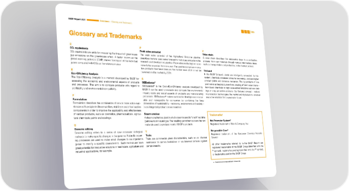 BASF Report 2021 Overviews – Glossary and Trademarks 289 Glossary and Trademarks C P V CO equivalents Peak sales potential Value chain 2 CO equivalents are units for measuring the impact of greenhouse The peak sales potential of the Agricultural Solutions pipeline A value chain describes the successive steps in a production 2 gas emissions on the greenhouse effect. A factor known as the describes the total peak sales forecast for individual products in the process: from raw materials through various intermediate steps, global warming potential (GWP) shows the impact of the individual research and development pipeline. Peak sales are the highest sales such as transportation and production, to the finished product. gases compared with CO as the reference value. value to be expected from one year. The pipeline comprises innova- 2 tive products that have been on the market since 2021 or will be Verbund E launched on the market by 2031. In the BASF Verbund, plants are intelligently connected. In this Eco-Efficiency Analysis system, chemical processes consume less energy, produce higher The Eco-Efficiency Analysis is a method developed by BASF for S product yields and conserve resources. The by-products of one assessing the economic and environmental aspects of products SEEbalance® plant serve as feedstock elsewhere, creating efficient value chains – ® and processes. The aim is to compare products with regard to SEEbalance is the Socio-Eco-Efficiency analysis developed by from basic chemicals to high value-added solutions such as coat- profitability and environmental compatibility. BASF. It can be used to evaluate and compare the environmental ings or crop protection products. Our Verbund concept – realized impact, costs and social aspects of products and manufacturing in production, technologies, the market and digitalization – enables ® makes sustainable development measur- F processes. SEEbalance innovative solutions for a sustainable future. Formulation able and manageable for companies by combining the three Formulation describes the combination of one or more active sub- dimensions of sustainability – economy, environment and society – stances with excipients like emulsifiers, stabilizers and other inactive in an integrated product assessment tool. components in order to improve the applicability and effectiveness of various products, such as cosmetics, pharmaceuticals, agricul - Steam cracker Trademarksa tural chemicals, paints and coatings. A steam cracker is a plant in which steam is used to “crack” naphtha ® (petroleum) or natural gas. The resulting petrochemicals are the raw Net Promoter System G materials used to produce most of BASF’s products. Registered trademark of Bain & Company, Inc. Genome editing ® Genome editing refers to a series of new molecular biological T Responsible Care methods to make specific changes in the genome. Naturally occurr- Traits Registered trademark of the European Chemical Industry ing processes are used to make small changes to an organism’s Traits are commercial plant characteristics, such as an inherent Council genes to modify a specific characteristic. Such techniques have resistance to certain herbicides or an inherent defense against great potential for innovative solutions in healthcare, agriculture and certain insects. All other trademarks referred to in the BASF Report are industrial applications, for example. registered trademarks of the BASF Group (identified with the ® TM symbol), trademarks pending (identified with the symbol), or trademarks used by the BASF Group. a Trademarks are not registered/used in all countries.