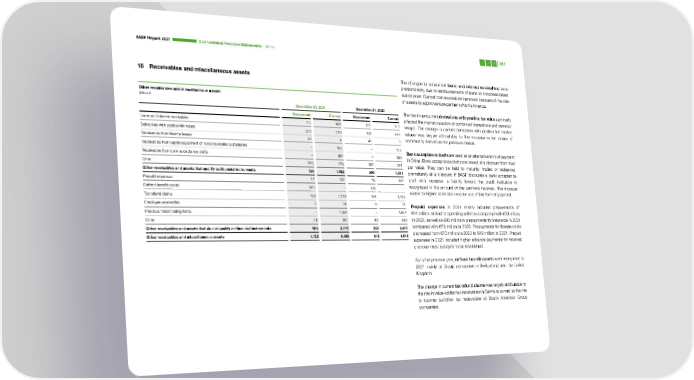 BASF Report 2021 Consoli dated Financial Statements – Notes 247 18 Receivables and miscellaneous assets The changes in noncurrent loans and interest receivables were predominantly due to reimbursements of loans to nonconsolidated subsidiaries. Current loan receivables increased because of the sale Other receivables and miscellaneous assets of assets to a joint venture partner in North America. Million € December 31, 2021 December 31, 2020 The rise in noncurrent derivatives with positive fair values primarily Noncurrent Current Noncurrent Current affected the market valuation of combined interest rate and currency Loans and interest receivables 93 149 127 123 swaps. The change in current derivatives with positive fair market Derivatives with positive fair values 335 610 105 414 values was largely attributable to the increase in fair values of Receivables from finance leases 40 4 41 3 commodity derivatives for precious metals. Receivables from capital equipment of nonconsolidated subsidiaries – 167 – 122 Bank acceptance drafts are used as an alternative form of payment Receivables from bank acceptance drafts – 387 – 288 in China. Bank acceptance drafts are issued at a discount from their Other 270 376 287 261 par value. They can be held to maturity, traded or redeemed Other receivables and assets that qualify as financial instruments 738 1,692 560 1,211 prematurely at a discount. If BASF discounts a bank acceptance Prepaid expenses 77 327 79 257 draft with recourse, a liability toward the credit institution is Defined benefit assets 661 – 126 – recognized in the amount of the payment received. The increase Tax refund claims 198 1,610 104 1,158 relates to higher sales and broader use of this form of payment. Employee receivables 0 24 0 21 Prepaid expenses in 2021 mainly included prepayments of Precious metal trading items – 1,554 – 1,604 €41 million related to operating activities compared with €28 million Other 48 361 43 422 in 2020, as well as €93 million in prepayments for insurance in 2021 Other receivables and assets that do not qualify as financial instruments 984 3,876 352 3,462 compared with €79 million in 2020. Prepayments for license costs Other receivables and miscellaneous assets 1,722 5,568 912 4,673 decreased from €70 million in 2020 to €49 million in 2021. Prepaid expenses in 2021 included higher advance payments for received precious metal catalysts to be refurbished. As in the previous year, defined benefit assets were recognized in 2021 mainly at Group companies in Switzerland and the United Kingdom. The change in current tax refund claims was largely attributable to the rise in value-added tax receivables in Germany as well as the rise in income tax/other tax receivables at South American Group companies.