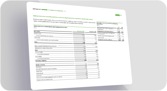 BASF Report 2021 Consoli dated Financial Statements – Notes 229 Additional information on the Wintershall Dea material non-integral investment accounted for using the equity method The following table contains financial information on the W intershall Dea material non-integral shareholding accounted for using the equity Reconciliation of the carrying amount of the shareholding in method, including adjustments for fair value made at initial recognition and the resulting effects on earnings. Wintershall Dea Million € 2021 2020 BASF interest in equity attributable to shareholders of 72.7% 72.7% Financial information on Wintershall Dea, Kassel/Hamburg, Germany (100%) Wintershall Dea AG Million € Carrying amount as of the beginning of the year 10,199 12,402 December 31, 2021 December 31, 2020 Proportional income after taxes and other adjustments to –344 –890 Balance Sheet income and expenses Noncurrent assets 27,216 27,881 Proportional changes in other comprehensive income 216 –1,256 of which goodwill from fair value adjustments 2,740 2,740 Dividends received 488 57 Current assets 4,666 2,459 Carrying amount as of the end of the year 9,583 10,199 of which marketable securities, cash and cash equivalents 2,106 821 Assets 31,882 30,340 Equity attributable to shareholders of Wintershall Dea AG 13,182 14,029 Subordinate bonds issued by Wintershall Dea 1,525 – Equity 14,707 14,029 Noncurrent liabilities 12,039 14,343 of which financial indebtedness 4,055 5,886 Current liabilities 5,136 1,968 of which financial indebtedness 575 471 Total equity and liabilities 31,882 30,340 Statement of income 2021 2020 Sales revenue 7,804 3,642 Amortization/impairment and reversals of impairments –2,765 –3,080 Interest income 135 122 Interest expenses –39 –39 Income taxes –1,498 –424 Income after taxes and other adjustments to income and expenses –473 –1,224 Changes in other comprehensive income 296 –1,728