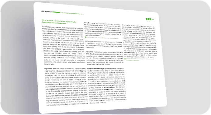 BASF Report 2021 Consoli dated Financial Statements – Notes 204 Use of estimates and assumptions in preparing the testing. It comprises a risk-free interest rate, the market risk premium Climate policies are also causing fundamental changes in the Consolidated Financial Statements and an industry-specific spread for the credit risk. Additional automotive industry, one of BASF’s key customer industries. The important assumptions are the forecasts for the detailed planning transition to electromobility will have a long-term negative impact The carrying amount of assets, liabilities and provisions, contingent period and the terminal growth rates used. Fair value less costs to on the emissions catalyst business. This development was liabilities and other financial obligations reported in the Consolidated sell must be determined for the impairment test of disposal groups; accounted for in the adjustment of the growth rate for the goodwill Financial Statements depends on the use of estimates, assumptions specific assumptions relating to the respective transaction must be impairment test and did not lead to an impairment. Other BASF and discretionary scope. Specific estimates or assumptions used in made for this determination. businesses will benefit from this transformation; for example, individual accounting or valuation methods are disclosed in their For more information, see Note 3 from page 207 onward and Note 14 from page 236 onward demand for innovative lightweight materials and battery materials respective sections of the Notes to the Consolidated Financial will grow. Furthermore, climate policies can influence the business Statements. They are based on the circumstances and estimates on An impairment is recognized if the recoverable amount of the asset of oil and gas producers such as Wintershall Dea, which BASF the balance sheet date and thus affect the amounts of income and is lower than the carrying amount. The impaired asset (excluding accounts for using the equity method. Nevertheless, given the large expenses shown for the reporting periods presented. These goodwill) is written down by the amount of the difference between share of gas in Wintershall Dea’s production and reserves as well as assumptions primarily relate to the determination of discounted these amounts. the acceptance of gas as a bridge technology, it can be assumed cash flows in the context of impairment tests and purchase price that these assets are fundamentally recoverable. The price allocations; the useful lives of depreciable property, plant and The goodwill impairment test is based on cash-generating units. At assumptions applied for the impairment test reflected current equipment and intangible assets; the carrying amount of BASF, these largely correspond to the business units, or in individual developments regarding climate neutrality as well as a possible oil shareholdings; and the measurement of provisions for items such as cases the divisions. If there is a need for impairment, the existing and gas shortage due to lack of investment in this industry. employee benefits, warranties, trade discounts, environmental goodwill is, if necessary, completely written off as a first step. If there For more information on climate and sustainability, see Wintershall Dea’s annual report at protection and taxes. Although uncertainty is appropriately is further need for impairment, this is allocated to the remaining wintershalldea.com/en/investor-relations incorporated in the valuation factors, actual results can differ from assets of the cash-generating unit. Goodwill impairments are these estimates. reported under other operating expenses. Impairment tests on assets are carried out whenever certain Climate and sustainability-related developments: The chemical triggering events indicate potential impairment. External triggering industry is resource-intensive. BASF is committed to the Paris events include, for example, changes in customer industries, Climate Agreement: Using resources as efficiently and responsibly technologies used and economic downturns. Internal triggering as possible and the concept of a circular economy are firmly events for an impairment test include lower product profitability, embedded in BASF’s strategy and its actions, supported by the planned restructuring measures or physical damage to assets. Verbund structure, clearly defined ambitious targets for reducing Impairment tests entail a comparison of the carrying amount and the CO, and the use of renewable and recycled feedstocks. BASF 2 recoverable amount. The recoverable amount is the higher of fair always strives to employ raw materials more efficiently and improve value less costs to sell and the value in use. As a rule, value in use is production processes as well as to continuously seek ways to use determined using the discounted cash flow method. The estimation non-fossil, renewable or recycled feedstocks. For this reason, of cash flows and the assumptions used consider all information current developments and measures relating to climate change and available on the respective balance sheet date on the future sustainability do not lead to fundamentally changed expectations development of the operating business. Actual future developments with regard to useful lives or recoverability of the majority of may vary. Impairment testing relies upon the cash-generating unit’s noncurrent assets. There is also no material need for adjustments to long-term earnings forecasts, which are based on macroeconomic provisions for environmental and restoration obligations. In individual trends. The weighted average cost of capital (WACC) based on the cases, however, plants may be shut down if necessary for reasons capital asset pricing model plays an important role in impairment of environmental protection.