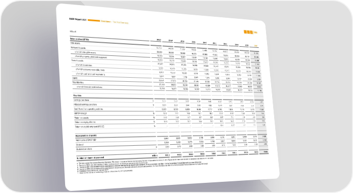BASF Report 2021 Overviews – Ten-Year Summary 288 Million € 2012a 2013b 2014 2015 2016 2017 2018 2019 2020 2021 Balance sheet (IFRS) Total assets 62,726 64,204 71,359 70,836 76,496 78,768 86,556 86,950 80,292 87,383 Noncurrent assets 35,259 38,253 43,939 46,270 50,550 47,623 43,335 55,960 50,424 52,332 of which intangible assets 12,193 12,324 12,967 12,537 15,162 13,594 16,554 14,525 13,145 13,499 of which property, plant and equipment 16,610 19,229 23,496 25,260 26,413 25,258 20,780 21,792 19,647 21,553 Current assets 27,467 25,951 27,420 24,566 25,946 31,145 43,221 30,990 29,868 35,051 of which inventories 9,581 10,160 11,266 9,693 10,005 10,303 12,166 11,223 10,010 13,868 of which accounts receivable, trade 9,506 10,233 10,385 9,516 10,952 10,801 10,665 9,093 9,466 11,942 of which cash and cash equivalents 1,647 1,827 1,718 2,241 1,375 6,495 2,300 2,427 4,330 2,624 Equity 25,621 27,673 28,195 31,545 32,568 34,756 36,109 42,350 34,398 42,081 Total liabilities 37,105 36,531 43,164 39,291 43,928 44,012 50,447 44,600 45,894 45,301 of which financial indebtedness 12,798 14,407 15,384 15,197 16,312 18,032 20,841 18,377 19,214 17,184 Key data c Earnings per share € 5.25 5.22 5.61 4.34 4.42 6.62 5.12 9.17 –1.15 6.01 c Adjusted earnings per share € 5.64 5.31 5.44 5.00 4.83 6.44 5.87 4.00 3.21 6.76 Cash flows from operating activities 6,602 8,100 6,958 9,446 7,717 8,785 7,939 7,474 5,413 7,245 c d EBITDA margin % 13.9 14.1 14.9 15.1 18.3 17.6 14.9 13.8 11.0 14.4 c Return on assets % 11.0 11.5 11.7 8.7 8.2 9.5 7.1 4.5 –1.2 9.5 Return on equity after tax % 19.9 19.2 19.7 14.4 13.3 18.9 14.1 21.6 –2.8 15.6 d Return on capital employed (ROCE) % – – – – – 15.4 12.0 7.7 1.7 13.5 Appropriation of profits Net income of BASF SEe 2,880 2,826 5,853 2,158 2,808 3,130 2,982 3,899 3,946 3,928 f Dividend 2,388 2,480 2,572 2,664 2,755 2,847 2,939 3,031 3,031 3,123 Dividend per share € 2.60 2.70 2.80 2.90 3.00 3.10 3.20 3.30 3.30 3.40 Number of shares at year-end million 918.5 918.5 918.5 918.5 918.5 918.5 918.5 918.5 918.5 918.5 a We have applied International Reporting Standards IFRS 10 and 11 as well as International Accounting Standard 19 (revised) since January 1, 2013. Figures for 2012 have been restated; no restatement was made for 2011 and earlier. b Figures for 2013 have been adjusted to reflect the dissolution of the natural gas trading business disposal group. c Figures for 2017 were restated with the presentation of the oil and gas activities as discontinued operations. For more information, see Note 1.4 to the Consolidated Financial Statements from page 203 onward d Figures for 2018 were restated with the presentation of the construction chemicals activities as discontinued operations. For more information, see Note 1.4 to the Consolidated Financial Statements from page 203 onward^ e Calculated in accordance with German GAAP f Based on the number of outstanding shares as of December 31, 2021 (918,478,694)