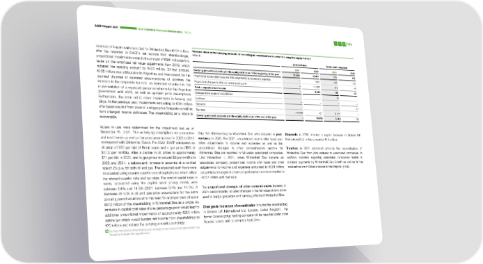 BASF Report 2021 Consoli dated Financial Statements – Notes 228 reversals of impairments recorded for Wintershall Dea (€161 million Reconciliation of the carrying amounts of non-integral investments accounted for using the equity method after tax reported in BASF’s net income from shareholdings), Million € proportional impairments arose in the amount of €680 million before Joint ventures Associated companies taxes on the amortized fair value adjustments from 2019, which 2021 2020 2021 2020 reduced the carrying amount by €420 million. Of that amount, Carrying amounts according to the equity method as of the beginning of the year 10,199 12,401 675 722 €408 million was attributable to Argentina, and was caused by the Proportional income after taxes and other adjustments to income and expenses – –890 –304 –35 planned disposal of operated unconventional oil activities, the Proportional changes in other comprehensive income – –1,255 216 –2 increase in the corporate tax rate, an increased country risk, the Total comprehensive income − –2,145 –88 –37 implementation of a regulated gas price scheme by the Argentine government until 2028, as well as updated price assumptions. Changes in the scope of consolidation – – –18 – Furthermore, the latter led to minor impairments in Norway and Additions – – – – Libya. In the previous year, impairments amounting to €791 million Disposals – – – –10 after taxes resulted from lower oil and gas price forecasts as well as Transfers –10,199 –57 9,274 – from changed reserve estimates. The shareholding as a whole is Carrying amounts according to the equity method as of the end of the year − 10,199 9,843 675 recoverable. Values in use were determined for the impairment test as of December 31, 2021. The underlying assumptions for production Only the shareholding in Wintershall Dea was included in joint Disposals in 2020 included a capital decrease in Solenis UK and cost trends as well as the price assumptions for 2023 to 2040 ventures in 2020. For 2021, proportional income after taxes and International Ltd. in the amount of €10 million. correspond with Wintershall Dea’s. For 2022, BASF anticipates an other adjustments to income and expenses as well as the oil price of $75 per bbl of Brent crude and a gas price (TTF) of proportional changes in other comprehensive income for Transfers in 2021 contained primarily the reclassification of $17.2 per mmBtu. After a decline in oil prices to approximately Wintershall Dea are reported in full under associated companies. Wintershall Dea from joint ventures to associated companies. In $71 per bbl in 2023, and in gas prices to around $8 per mmBtu in Until November 1, 2021, when Wintershall Dea became an addition, transfers regarding associated companies related to 2023 and 2024, a subsequent increase is assumed at a nominal associated company, proportional income after taxes and other dividend payments by Wintershall Dea GmbH as well as to the rate of 2% p.a. for both oil and gas. The expected cash flows were adjustments to income and expenses amounted to €258 million; reclassification of Solenis shares to the disposal group. discounted using country-specific cost of capital rates, which reflect proportional changes in other comprehensive income amounted to the relevant country risks and tax rates. The cost of capital rates in –€757 million until that date. euros, calculated using the capital asset pricing model, were between 3.4% and 14.3% (2021: between 3.4% and 14.4%). A The proportional changes of other comprehensive income in decrease of 10% in oil and gas price assumptions for the entire 2021 predominantly included changes in the fair value of derivatives planning period would result in the need for an impairment of about used to hedge gas prices and currency effects of Wintershall Dea. €613 million of the shareholding in Wintershall Dea as a whole. An increase in capital cost rates of one percentage point would lead to Changes in the scope of consolidation included the shareholding additional proportional impairments of appr oximately €200 million in Solenis UK International Ltd, London, United Kingdom. The before tax which would burden net income fr om shareholdings by former Solenis group holding company will be reported under other €70 million and reduce the carrying amount accordingly. financial assets until its complete liquidation. For more information on Wintershall Dea, see the chapter on Non-Integral Oil and Gas Business in the Management’s Report from page 93 onward