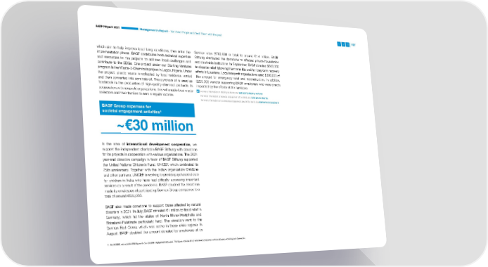 BASF Report 2021 Management’s Report – We Value People and Treat Them with Respect 107 which aim to help improve local living conditions, then enter the German sites (€702,668 in total) to around €1.4 million. BASF implementation phase. BASF contributes both technical expertise Stiftung distributed the donations to affected private households and resources to the projects to address local challenges and and charitable institutions. In September, BASF donated $500,000 contribute to the SDGs. One project under our Starting Ventures to disaster relief following Hurricane Ida and for long-term recovery program is the Waste- 2- Chemicals project in Lagos, Nigeria. Under efforts in Louisiana. Local nonprofit organizations used $300,000 of the project, plastic waste is collected by local residents, sorted this amount for emergency relief and reconstruction. In addition, and then converted into pyrolysis oil. This pyrolysis oil is used as $200,000 went to supporting BASF employees who were directly feedstock in the production of high-quality chemical products. In impacted by the effects of the hurricane. cooperation with nonprofit organizations, this will enable local waste For more information on Starting Ventures, see basf.com/en/starting-ventures collectors and their families to earn a regular income. For more information on societal engagement at our sites, see ludwigshafen.basf.de For more information on our societal engagement around the world, see basf.com/en/engagement BASF Group expenses for societal engagement activities¹ ~€30 million In the area of international development cooperation, we support the independent charitable BASF Stiftung with donations for its projects in cooperation with various organizations. The 2021 year-end donation campaign in favor of BASF Stiftung supported the United Nations Children’s Fund, UNICEF, which celebrated its 75th anniversary. Together with the Indian organization ChildLine and other partners, UNICEF is working to provide psychosocial care for children in India who have had difficulty accessing important services as a result of the pandemic. BASF doubled the donations made by employees of participating German Group companies to a total of around €600,000. BASF also made donations to support those affected by natural disasters in 2021. In July, BASF donated €1 million to flood relief in Germany, which hit the states of North Rhine-Westphalia and Rhineland-Palatinate particularly hard. The donation went to the German Red Cross, which was active in these crisis regions. In August, BASF doubled the amount donated by employees at its 1 As of 2020, we report a total figure for our societal engagement activities. The figure includes all consolidated companies with employees, including joint operations.