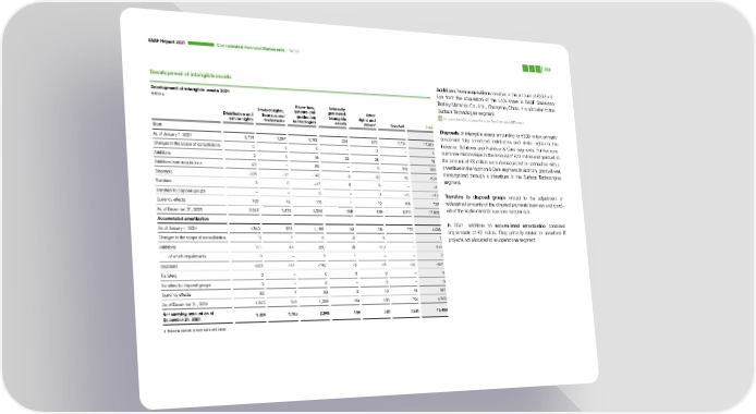 BASF Report 2021 Consoli dated Financial Statements – Notes 238 Development of intangible assets Additions from acquisitions resulted in the amount of €392 mil- lion from the acquisition of the 51% share in BASF Shanshan Development of intangible assets 2021 Battery Materials Co., Ltd., Changsha, China. It is allocated to the Million € Surface Technologies segment. Know-how, Internally Product rights, patents and generated Other For more information on acquisitions, see Note 3 from page 207 onward Distribution and licenses and production intangible rights and a similar rights trademarks technologies assets values Goodwill Total Disposals of intangible assets amounting to €638 million primarily Cost concerned fully amortized distribution and similar rights in the As of January 1, 2021 2,731 1,387 4,182 234 973 7,734 17,241 Industrial Solutions and Nutrition & Care segments. Furthermore, Changes in the scope of consolidation 0 6 0 – 0 – 6 customer relationships in the amount of €72 million and goodwill in Additions 2 1 16 32 28 – 78 the amount of €8 million were derecognized in connection with a Additions from acquisitions 45 – 89 – 5 254 392 divestiture in the Nutrition & Care segment. In addition, goodwill was derecognized through a divestiture in the Surface Technologies Disposals –335 –17 –142 –3 –82 –60 –638 segment. Transfers 0 0 –17 5 8 – –4 Transfers to disposal groups – – 0 – 0 –13 –13 Transfers to disposal groups related to the adjustment of Currency effects 105 42 176 1 16 400 739 reclassified amounts of the divested pigments business and good- As of December 31, 2021 2,547 1,419 4,304 268 949 8,314 17,802 will of the kaolin minerals business held for sale. Accumulated amortization In 2021, additions to accumulated amortization contained As of January 1, 2021 1,340 275 1,185 140 381 775 4,096 impairments of €2 million. They primarily related to unrealized IT Changes in the scope of consolidation 0 7 0 0 0 – 7 projects not allocated to an operational segment. Additions 171 44 260 26 113 – 614 of which impairments 0 – 1 1 – – 2 Disposals –320 –17 –142 –3 –74 –26 –581 Transfers 0 – 0 0 0 – 0 Transfers to disposal groups 0 – 0 – 0 – 0 Currency effects 52 7 52 0 10 45 167 As of December 31, 2021 1,243 316 1,356 164 430 794 4,303 Net carrying amount as of 1,304 1,103 2,949 104 520 7,520 13,499 December 31, 2021 a Including licenses to such rights and values