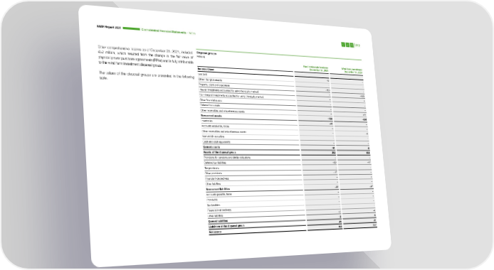 BASF Report 2021 Consoli dated Financial Statements – Notes 212 Other comprehensive income as of December 31, 2021, included Disposal groups €52 million, which resulted from the change in the fair value of Million € physical power purchase agreements (PPAs) and is fully attributable Kaolin minerals business Wind farm investment December 31, 2021 December 31, 2021 to the wind farm investment disposal group. Balance Sheet Goodwill –5 – The values of the disposal groups are presented in the following Other intangible assets – – table. Property, plant and equipment –153 – Integral investments accounted for using the equity method – –565 Non-integral investments accounted for using the equity method – – Other financial assets – – Deferred tax assets – – Other receivables and miscellaneous assets – –71 Noncurrent assets –158 –636 Inventories –44 – Accounts receivable, trade – – Other receivables and miscellaneous assets – –2 Marketable securities – – Cash and cash equivalents – – Current assets –44 –2 Assets of the disposal group 202 638 Provisions for pensions and similar obligations – – Deferred tax liabilities –20 –17 Tax provisions – – Other provisions –17 – Financial indebtedness – – Other liabilities – – Noncurrent liabilities –37 –17 Accounts payable, trade – – Provisions – – Tax liabilities – – Financial indebtedness – – Other liabilities –2 –4 Current liabilities –2 –4 Liabilities of the disposal group 39 21 Net assets 163 617