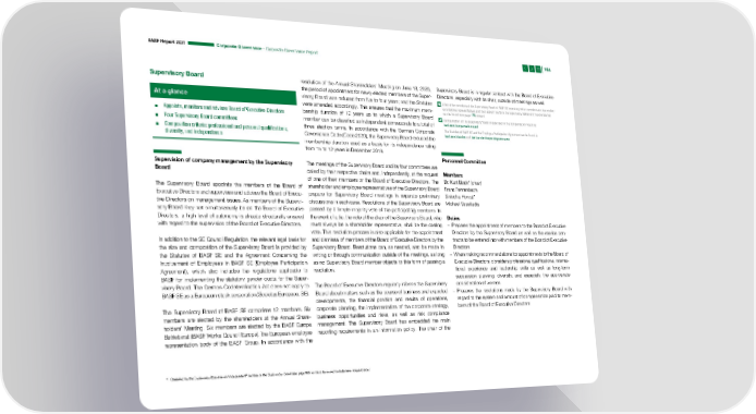 BASF Report 2021 Corporate Governance – Corporate Governance Report 164 Supervisory Board resolution of the Annual Shareholders’ Meeting on June 18, 2020, Supervisory Board is in regular contact with the Board of Executive the period of appointment for newly elected members of the Super- Directors, especially with its chair, outside of meetings as well. At a glance visory Board was reduced from five to four years; and the Statutes A list of the members of the Supervisory Board of BASF SE indicating which members are shareholder were amended accordingly. This ensures that the maximum mem- or employee representatives and their appointments to the supervisory bodies of other companies can be found from page 175 onward ▪ Appoints, monitors and advises Board of Executive Directors bership duration of 12 years up to which a Supervisory Board Compensation of the Supervisory Board is described in the Compensation Report at ▪ Four Supervisory Board committees member can be classified as independent corresponds to a total of basf.com/compensationreport three election terms. In accordance with the German Corporate The Statutes of BASF SE and the Employee Participation Agreement can be found at ▪ Composition criteria: professional and personal qualifications, Governance Code (Code 2020), the Supervisory Board reduced the basf.com/statutes and basf.com/en/corporategovernance diversity, and independence membership duration used as a basis for its independence rating from 15 to 12 years in December 2019. Personnel Committee Supervision of company management by the Supervisory The meetings of the Supervisory Board and its four committees are Board called by their respective chairs and, independently, at the request Members of one of their members or the Board of Executive Directors. The Dr. Kurt Bock* (chair) The Supervisory Board appoints the members of the Board of shareholder and employee representatives of the Supervisory Board Franz Fehrenbach Executive Directors and supervises and advises the Board of Execu- prepare for Supervisory Board meetings in separate preliminary Sinischa Horvat* tive Directors on management issues. As members of the Supervi- discussions in each case. Resolutions of the Supervisory Board are Michael Vassiliadis sory Board may not simultaneously be on the Board of Executive passed by a simple majority vote of the participating members. In Directors, a high level of autonomy is already structurally ensured the event of a tie, the vote of the chair of the Supervisory Board, who Duties with regard to the supervision of the Board of Executive Directors. must always be a shareholder representative, shall be the casting – Prepares the appointment of members to the Board of Executive vote. This resolution process is also applicable for the appointment Directors by the Supervisory Board as well as the service con- In addition to the SE Council Regulation, the relevant legal basis for and dismissal of members of the Board of Executive Directors by the tracts to be entered into with members of the Board of Executive the size and composition of the Supervisory Board is provided by Supervisory Board. Resolutions can, as needed, also be made in Directors the Statutes of BASF SE and the Agreement Concerning the writing or through communication outside of the meetings, as long – When making recommendations for appointments to the Board of Involvement of Employees in BASF SE (Employee Participation as no Supervisory Board member objects to this form of passing a Executive Directors, considers professional qualifications, interna- Agreement), which also includes the regulations applicable to resolution. tional experience and leadership skills as well as long-term BASF for implementing the statutory gender quota for the Super- succession planning, diversity, and especially the appropriate visory Board. The German Codetermination Act does not apply to The Board of Executive Directors regularly informs the Supervisory consideration of women BASF SE as a European stock corporation (Societas Europaea, SE). Board about matters such as the course of business and expected – Prepares the resolutions made by the Supervisory Board with developments, the financial position and results of operations, regard to the system and amount of compensation paid to mem- The Supervisory Board of BASF SE comprises 12 members. Six corporate planning, the implementation of the corporate strategy, bers of the Board of Executive Directors members are elected by the shareholders at the Annual Share- business opportunities and risks, as well as risk compliance holders’ Meeting. Six members are elected by the BASF Europa management. The Supervisory Board has embedded the main Betriebs rat (BASF Works Council Europe), the European employee reporting requirements in an information policy. The chair of the representation body of the BASF Group. In accordance with the * Classified by the Supervisory Board as an “independent” member of the Supervisory Board (see page 166 for the criteria used to determine independence)