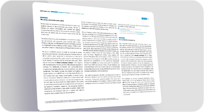 BASF Report 2021 Management’s Report – Our Sustainability Concept 47 Measuring sustainable value added Overall, the Value to Society method helps us to continually monitor be piloted by all member companies and the results will be fed back our progress. It complements existing concepts for assessing risks to the VBA for further development. We are aware that our business activities can have both positive and and business opportunities by providing a macro perspective and For more information on this method and the results of Value to Society, negative impacts on the environment and society. We aim to enables us to derive the necessary business steps. see basf.com/en/value-to-society increase our positive contributions and minimize the negative For more information on our sustainability tools, see basf.com/en/measurement-methods impacts of our business activities. To achieve this, we need to under- We are a founding member of the value balancing alliance e.V. (VBA) For more information on value balancing alliance e.V., see value-balancing.com stand how our actions and our products impact society and the and have contributed our knowledge and experience to this cross- environment. industry initiative. We support the development of an accounting and reporting standard that makes the value companies provide to Our stakeholder management We already have many years of experience in this area from evaluat- society transparent and comparable. The aim is to present the finan- ing our products and processes using methods such as Eco- cial, ecological, and social impacts of business activities on the basis Our stakeholders include customers, employees, investors, sup- ® Efficiency Analyses, the SEEbalance Socio-Eco-Efficiency Analysis, of a standardized framework. The VBA is supported by major audit- pliers, the communities surrounding our sites, and representatives our Sustainable Solution Steering portfolio analysis, BASF’s corpo- ing firms, the Organisation for Economic Co-operation and Develop- from industry, academia, politics and society. Parts of our business rate carbon footprint or the calculation of Product Carbon Footprints. ment (OECD), leading universities and other partners. Together with activities, such as the use of certain new technologies or our envi- the OECD and the Business for Inclusive Growth (B4IG) coalition, we ronmental impacts, are often viewed by stakeholders with a critical We want to holistically capture the value we contribute to society are pushing to further expand the social indicators. Here, BASF eye. We take these questions seriously, initiate dialogs and partici- along the value chain and make this transparent. However, there are leads the Impact Measurement working group together with pate in discussions. Such ongoing exchange with our stake- still no uniform, global standards for measuring and reporting on partners. Through the VBA, we are involved in the E.U.’s Platform on holders helps us to even better understand what matters to groups companies’ overall impact that cover economic, environmental and Sustainable Finance. Together with the VBA and other partners, we of society, what they expect of us and which measures we need to social aspects of business activities along the value chain. This is supported the establishment of the International Sustainability pursue in order to establish and maintain trust, build partnerships, why we developed the Value to Society method in 2013 together Standard Board (ISSB), are involved in the work of the World Eco- and increase societal acceptance for and the sustainability of our with external experts. We can use this methodological approach to nomic Forum (WEF) and are part of the G7 Impact Taskforce. Our business activities. In doing so, we want to harness potential for compare the significance of financial and sustainability-related Corporate Finance unit is also involved in the work of the European mutual value creation and strengthen societal acceptance of our impacts of our business activities on society and show their interde- Financial Reporting Advisory Group’s (EFRAG) Project Task Force on business activities. For important topics, we systematically identify pendencies. The results illustrate the positive contributions and European sustainability reporting standards. key stakeholders at an early stage to discuss critical questions negative effects, both at BASF and in our value chains. Positive fac- with them. Relevant considerations here include their topic-specific tors include taxes paid, wages, social benefits, employee training The method developed by the VBA was enhanced and refined on expertise and willingness to engage in constructive dialog. 1 and our net income. Negative contributions include environmental the basis of feedback from the scientific community and member impacts such as carbon emissions, land use and emissions to air, companies. Amendments include the addition of two social indica- We established an external, independent Stakeholder Advisory soil and water, as well as health and safety incidents. The positive tors and the calculation of downstream impacts, as well as revisions Council (SAC) in 2013 and the Human Rights Advisory Council 2 impacts of our economic activities declined in 2020, primarily due to to financial indicators, for example. This enhanced method will again (HRAC) in 2020. In the SAC, which is led by the Chairman of the the economic conditions caused by the coronavirus pandemic, Board of Executive Directors, international experts from academia which led to lower economic value added. In addition, higher water and society contribute their perspectives to discussions with BASF’s consumption and increased land use in supplier and customer Board of Executive Directors. The HRAC is an advisory body com- industries had a greater impact on the environment. prising external human rights specialists and internal experts. This helps us to critically reflect on ou