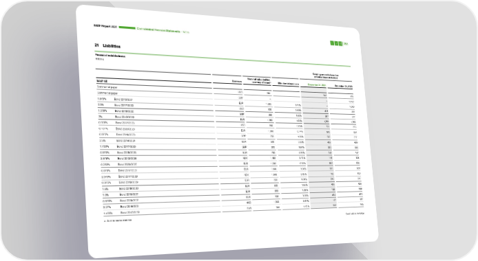 BASF Report 2021 Consoli dated Financial Statements – Notes 251 21 Liabilities Financial indebtedness Million € Carrying amounts based on effective interest method Nominal value (million, Currency currency of issue)a Effective interest rate December 31, 2021 December 31, 2020 BASF SE Commercial paper USD 280 248 178 Commercial paper GBP – – 1,112 1.875% Bond 2013/2021 EUR 1,000 1.47% – 1,000 2.5% Bond 2017/2022 USD 500 2.65% 441 407 1.375% Bond 2018/2022 GBP 250 1.52% 297 277 2% Bond 2012/2022 EUR 1,250 1.93% 1,251 1,252 0.925% Bond 2017/2023 USD 850 0.83% 739 673 0.101% Bond 2020/2023 EUR 1,000 0.14% 999 999 0.875% Bond 2016/2023 GBP 250 1.06% 297 277 2.5% Bond 2014/2024 EUR 500 2.60% 499 499 1.750% Bond 2017/2025 GBP 300 1.87% 356 332 0.875% Bond 2018/2025 EUR 750 0.97% 748 747 3.675% Bond 2013/2025 NOK 1,450 3.70% 145 138 0.250% Bond 2020/2027 EUR 1,000 0.32% 996 996 0.875% Bond 2017/2027 EUR 1,000 1.04% 990 989 2.670% Bond 2017/2029 NOK 1,600 2.69% 160 153 0.875% Bond 2019/2029 EUR 250 1.01% 248 247 1.5% Bond 2018/2030 EUR 500 1.63% 495 495 1.5% Bond 2016/2031 EUR 200 1.58% 199 199 0.875% Bond 2016/2031 EUR 500 1.01% 494 493 2.37% Bond 2016/2031 HKD 1,300 2.37% 147 137 1.450% Bond 2017/2032 EUR 300 1.57% 297 296 a As of the balance sheet date Continued on next page