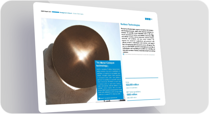 BASF Report 2021 Management’s Report – Surface Technologies 82 Surface Technologies The Surface Technologies segment comprises the Catalysts and Coatings divisions, which offer chemical solutions for surfaces. Its portfolio serves industries such as the auto- motive and chemical sectors and includes automotive OEM and refinish coatings, surface treatment, catalysts, battery materials, and precious and base metal services. We improve our customers’ applications and processes with tailored products, technologies and solutions, and support them through geographical proximity across all regions. The aim is to drive BASF’s growth by leveraging our portfolio of technologies and expanding our position as a leading and innovative provider of battery materials and surface coatings solutions. For more information on the Surface Technologies segment’s business model, see page 33 onward Tri-Metal Catalyst technology BASF’s innovative Tri-Metal Catalyst tech- nology enables the partial substitution of palladium with platinum in production pro- cesses. Although slightly more palladium is produced every year than platinum, demand for palladium is currently around three times higher. Tri-Metal Catalysts help Sales to reduce costs for automotive manu fac- €22,659 million turers and partially alleviate deficits in the platinum metals market. With this tech- 2020: €16,659 million nology, BASF expects to expand its market share and anticipates a total annual sales EBIT before special items potential of around €175 million by 2026. €800 million Discover Tri-Metal Catalysts at catalysts.basf.com 2020: €484 million